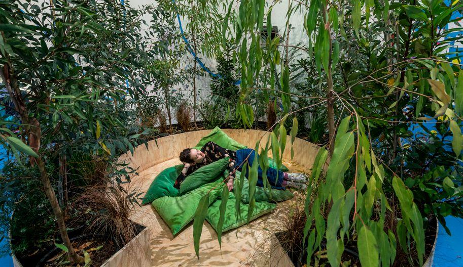 opposite page, top: Heather Hesterman, Plantbathing Lab, 2022, plywood, recycled crates, LED grow lights and plants. A part of The Children’s Sensorium. Image courtesy of the artist.