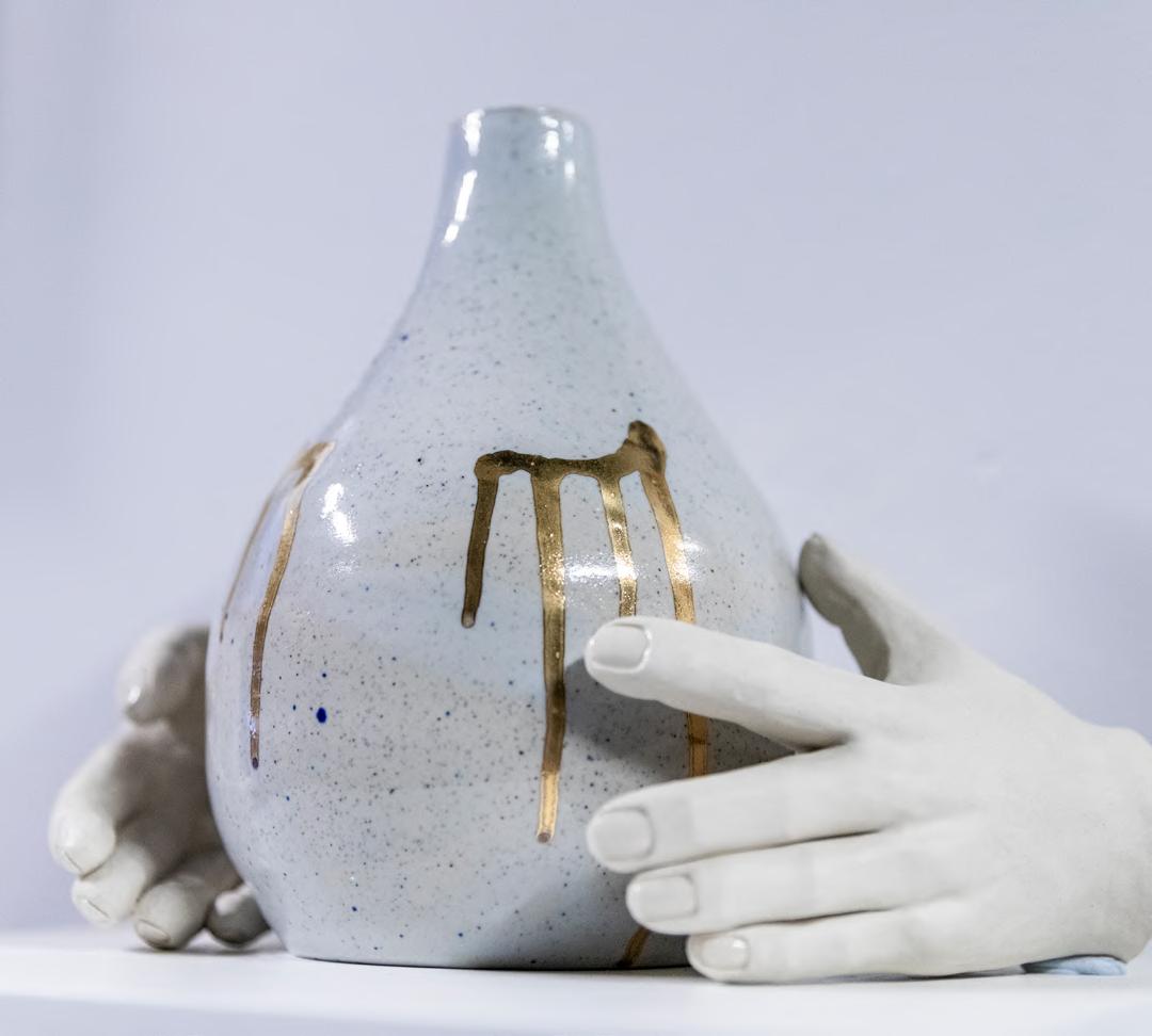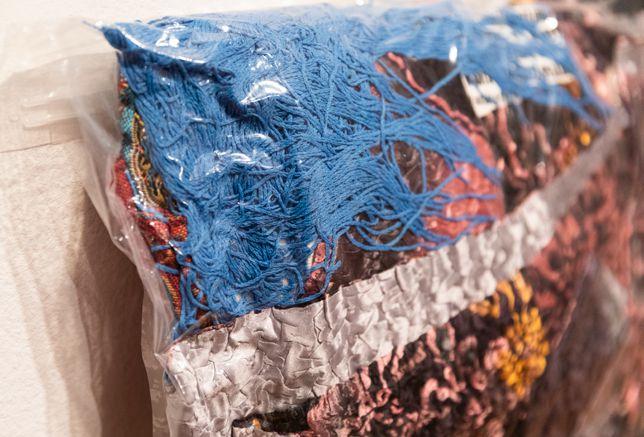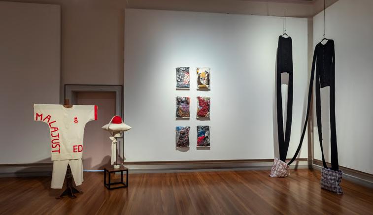 boarding school. Crosbie’s two oversized hand knitted jumpers, with five dangling sleeves speak to the ongoing dimensions of these experiences. Jude Worters also uses the language of garments and clothing to unpack and consider childhood memory, the legacy of trauma and the discomfort of not ‘fitting in.’ Mig Dann depicts the grief of losing her life partner through a series of six vacuum-packed bags of her clothes. As if documenting a last breath, the bags of colourful clothing form an archive that both holds and withholds the smells, textures and shapes of a loved one. Yi Won Park’s work also draws on the loss of a loved one. Park uses art to make sense of her parents passing and to acknowledge its connection to her personal experience of belonging, placemaking and cultural identity.