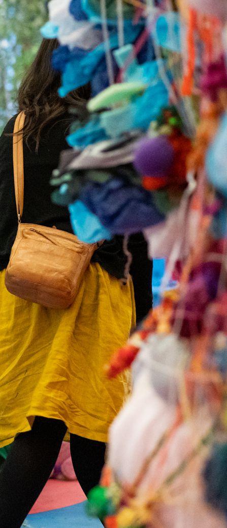 Set amongst many projects within Archives of Feeling: Sensation, Connection, Community we encounter The Children’s Sensorium developed by Dr Grace McQuilten and guided by Boonwurrung elder, N’arweet Carolyn Briggs drawing on the themes of nature using the Kulin calendar and supported by VicHealth. Foregrounding the importance of supporting and building resilience for our young people, having been so deeply impacted by the pandemic, this all-encompassing, participatory experience encourages children and their families to explore their senses, feelings, thoughts, and worries — smelling, touching and listening — to find comfort in this complicated world. It has been a delight to watch children and their carers fully interacting with the works on display.