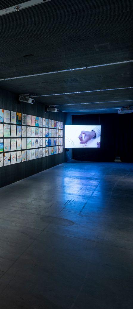 Also drawing on community contributions, The Vessel of Time by Taiwanese artist Che-Wei Chen presents an archive of drawings from the residents of the Taipei Veterans’ General Hospital Yuli Branch in Hualien. Each drawing responds to the idea of a ‘vessel,’ mostly exploring naval themes and journeying by water, penned by hand with soft, colourful pencils. Collectively, the 104 drawings map lived experiences of travel and displacement with a lightness of touch that belies the complex context of psychiatric internment following the traumas of military service and war. This more complex archive of lived experience comes to life in the video work installed at the far end of the grid of drawings; a video that enables individual residents to tell their stories of war, of mental health issues and of psychiatric treatment. In contrast, the work of Thembi Soddell provides a more intimate encounter with the intangible and ambiguous qualities of trauma. Soddell uses abstract, acousmatic sound to give form to their own lived experiences of complex trauma, bringing visitors into a very different world of sensation. Here, visitors are invited to enter into a pitch-black environment alone and to open their ears in the darkness. The work is as much an internal and idiosyncratic experience as a sensory one, which Soddell invites visitors to reflect on through journaling.
