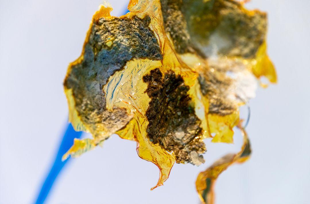Anna Schwann, Sky Charms (desert) (detail), 2022, paper pulp, bioplastic (gelatine, water, food colouring), air-drying clay, wire, spray paint, timber beads, synthetic scent (cinnamon bun). A part of The Children’s Sensorium. Image courtesy of the artist.
