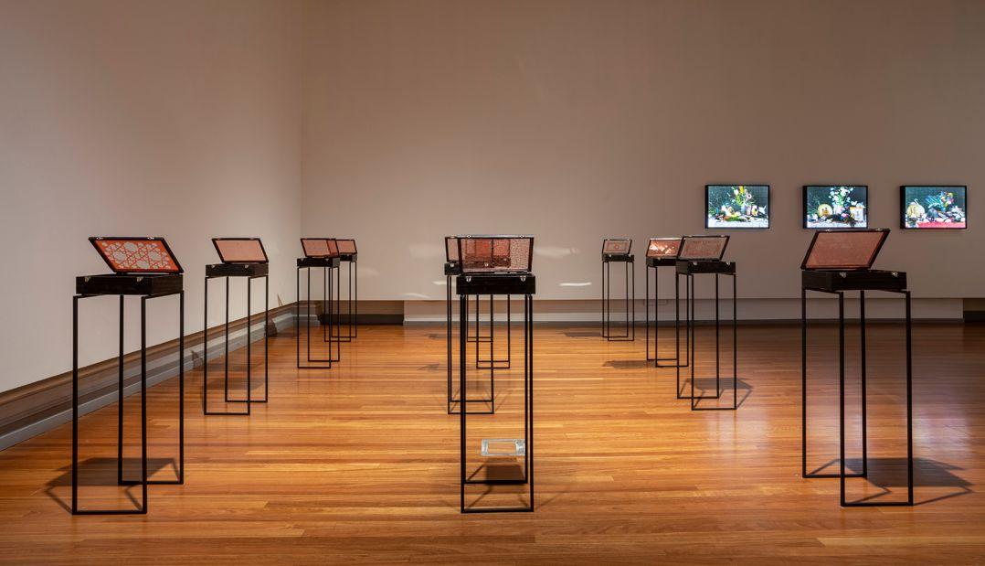 Installation image of Archives of Feeling: Trauma, Knowledge, Empathy. Image includes works by Rushdi Anwar, Maree Clarke, Peta Clancy, Yi Won Park and Jude Worters. Image courtesy of the artists, their representatives and the collections from which these works were loaned.