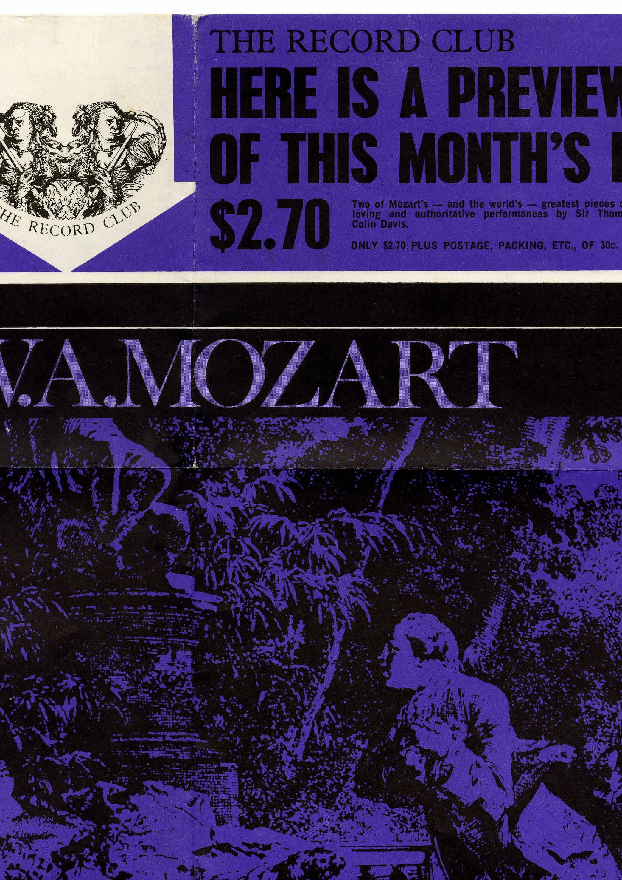 Promotional poster for the World Record Club’s monthly release, showing W.A. Mozart: Eine Kleine Nachtmusik, K.525 and Serenata Notturna, K.286. Courtesy of Geoff Hocking Cover