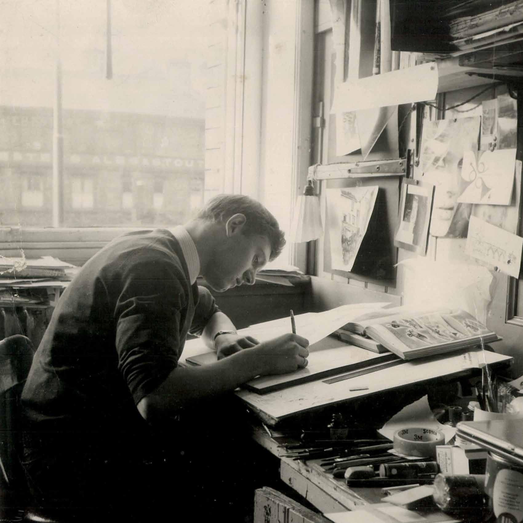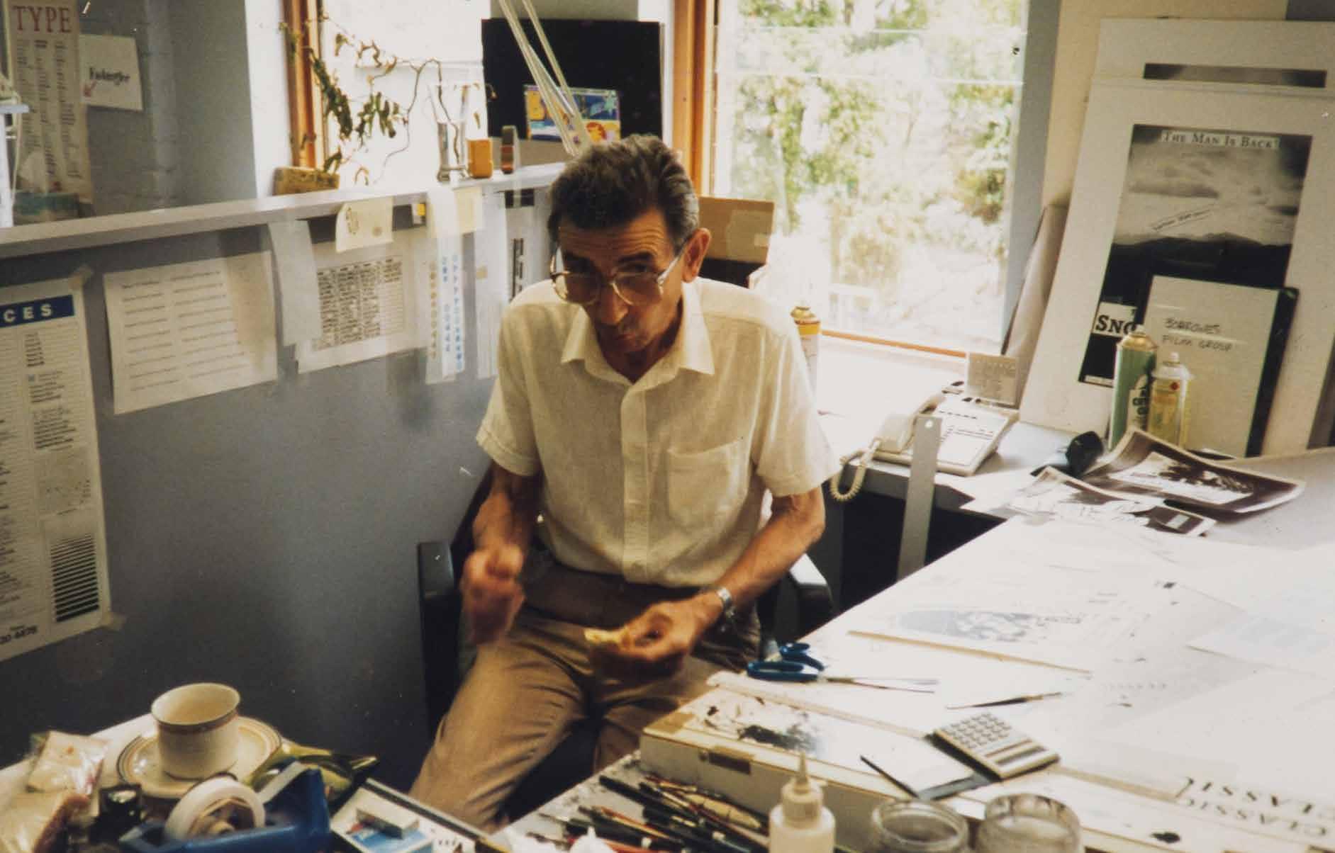 Top Godfrey (Geoffrey) Fawcett at the offices of David Lancashire Design c. 1980s