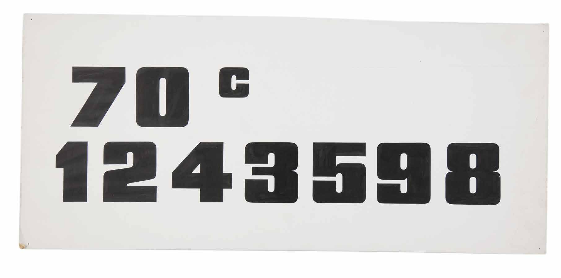 A piece that highlights this notion of ‘ingredient’ is a numeral set, presumably drawn for retail display. This features the price ‘70 cents’ on the top line and on the second line the rest of the numerals in that style to be used when the price changes. Charmingly, these are not presented in numerical order but rather in the order of their structural similarity (the ‘3’ being similar in structure to the ‘5’, the ‘9’ with the ‘8’ etc.), making the process of its creation and development evident as a ‘typographic toolkit’ for the designer, in this case, David Lancashire.