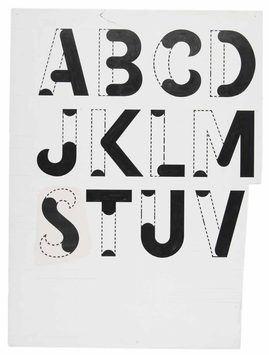 The ‘pragmatics of production’ permeate Fawcett’s work. To the modern eye, expecting a complete and persuasive design rendered speedily and slickly, the ‘incomplete’ nature of many artefacts within the Fawcett collection are oddly compelling because they reveal ‘fragments’ of artwork, ingredients that make up an unseen, eventually completed artwork. Fawcett would photocopy or bromide parts of the letters and make an assemblage replicating typographic curves and features to save time. Lancashire notes: ‘You don’t see anything behind a lot of current artwork. It’s all there. Now everything looks finished straight away – and it’s not. There’s no gap between the thought process and the ‘touchy-feely’. Process is the journey. Otherwise it’s just a superficial picture’.15