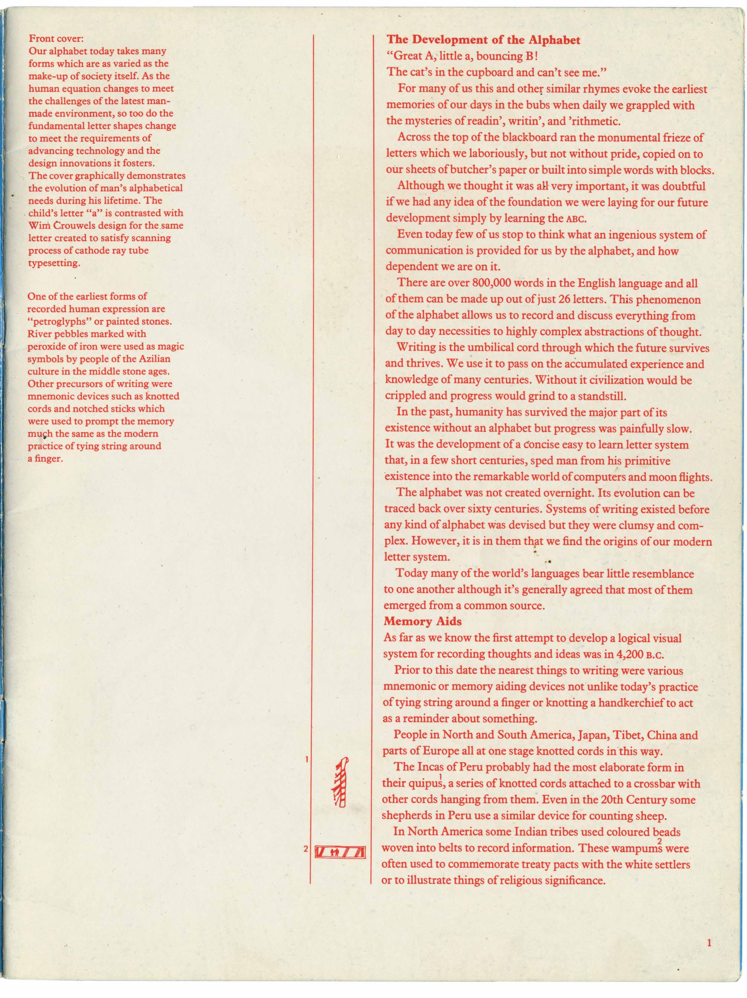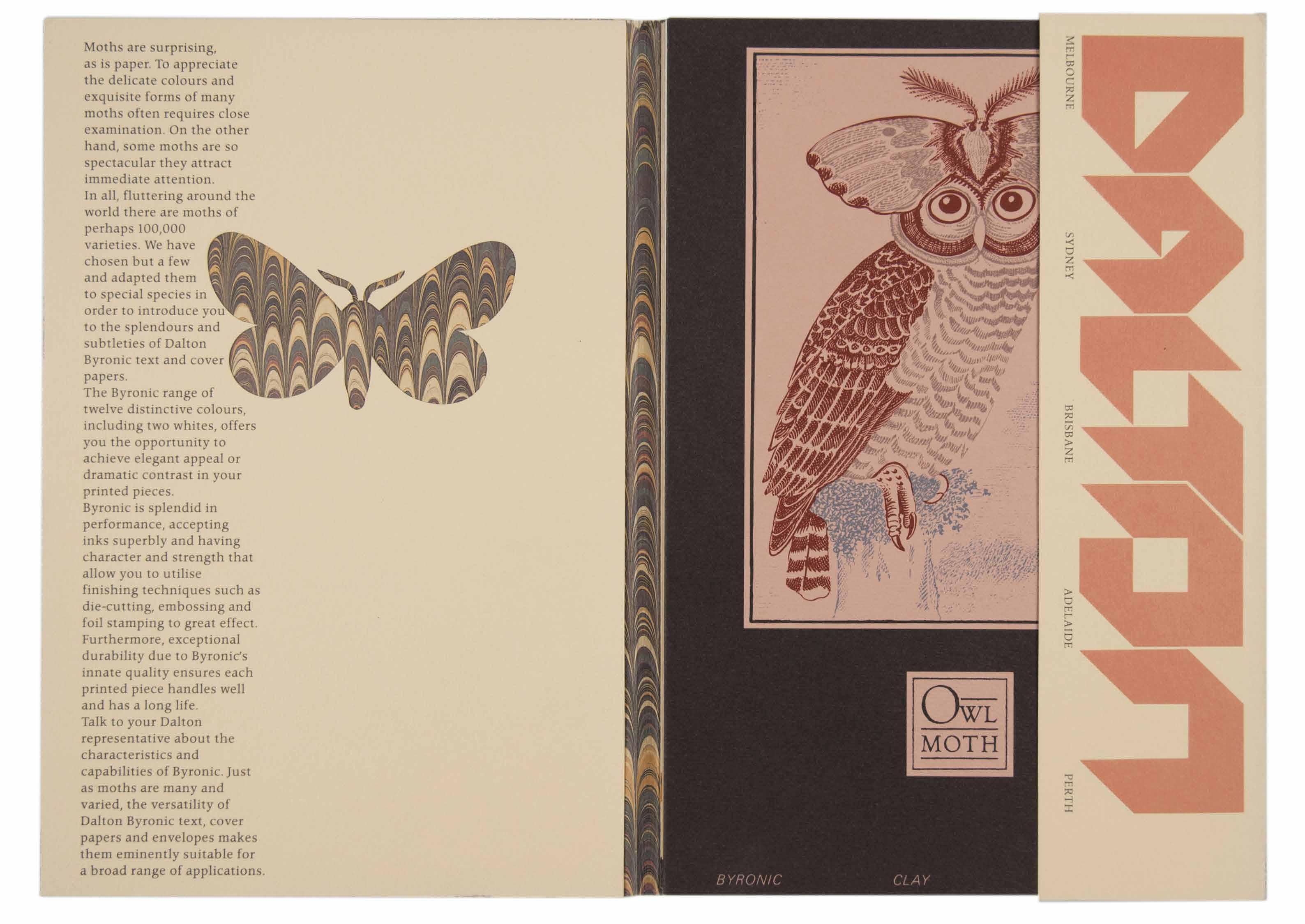 Changing focus, to examine what actually goes on inside the studio, Jenny Grigg gives us a detailed view of the work and working methods of David Lancashire, and particularly of Lancashire’s careerlong interest in the materiality of paper. As Grigg reveals, inspiration in Lancashire’s practice came from far and wide, and his concern for detail in turn bore discipline-wide benefits: While many practicing designers in Australia would have merely lamented the paucity of paper stocks available on our shores, Lancashire threw himself into a product develop ment role in the paper industry, seeing new stocks developed in and for Australia.