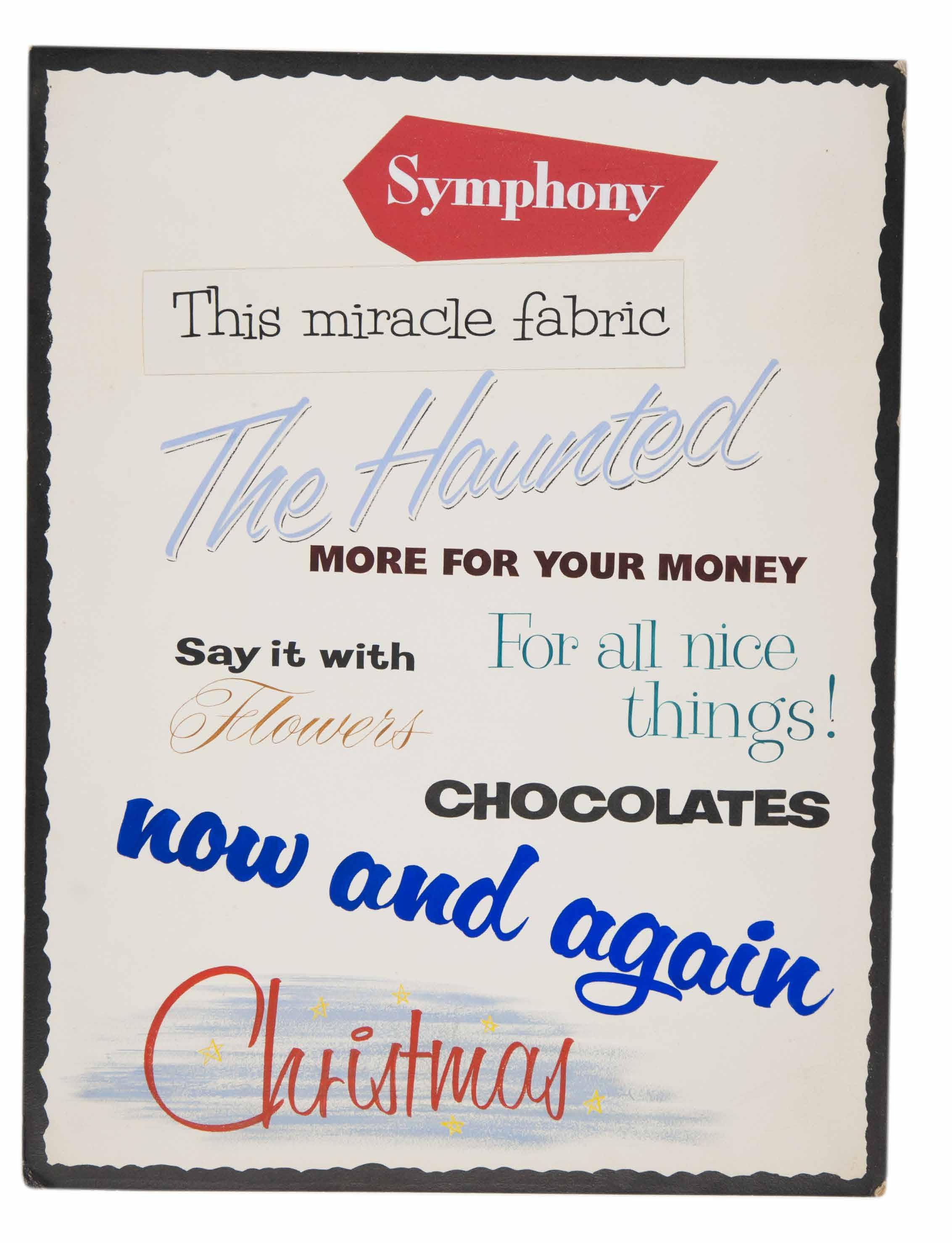 There are specific works within the collection that not only display the breadth of Fawcett’s deftness but also the very wide ‘jobbing’ scope letterers had to respond to during the era of commercial art. On a single board (see page 34), itself a bromided composite of lettering artwork, is displayed a crowded array of advertising and promotional statements in just about every superlative lettering treatment available: formal scripting, informal scripting, outlining, inlining, line-filling, swash-capping, drop-shadowing, reversing and contouring, amongst others. Words are given an almost onomatopoeic treatment –‘Wow!’ is rendered as blaring globes while ‘Gas the good flame for spring’ is emblazened with a half-line fill, an inline and drop-shadowing around a semicircle. The equivalent of an entire digital letterer’s portfolio presented en masse, the piece serves as an impressive testimony to Fawcett’s scope as a hand letterer. In this display, the words themselves seem to recede into the background, present only to express the commercial or ‘real life’ application of his technical prowess.