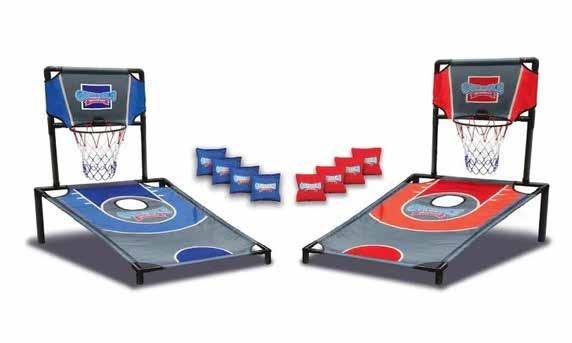 The thrill of basketball meets cornhole with this deluxe set, perfect for enthusiasts and athletes alike as well family members of all ages. Bring the excitement of the court to your backyard gatherings, ensuring endless fun and a competitive spirit. This creative twist of two games everyone knows the basics of doubles the fun. It has a convenient, tool-free setup. The set includes 2 game boards, 4 blue beanbags, 4 red beanbags and 1 carrying case. Each game board measures 3 x 2 x 3 feet and the beanbags are 4 x 4 inches.