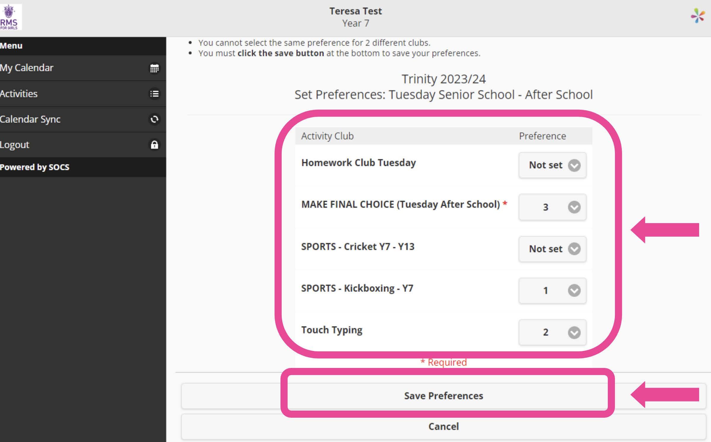 The highest number in any category will need to be given to ‘Make Final Choice’ to make sure you are not allocated an activity at random. Please remember to click on ‘Save Preference’ after making selections in every category you find a club you like to attend.