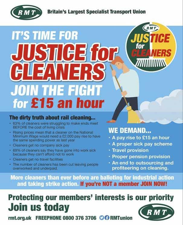Across nine separate railway cleaning contractors, RMT members voted massively for strike action in their fight for £15 an hour, free travel, and sick pay.