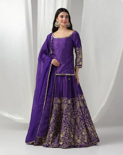 This purple zari silk lehenga for women is a true embodiment of royal charm and traditional luxury. Crafted in premium Dupion Silk, this lehenga is designed for women who appreciate deep hues paired with rich embroidery. The majestic purple shade symbolizes opulence and grace, making it an ideal choice for wedding ceremonies and evening functions