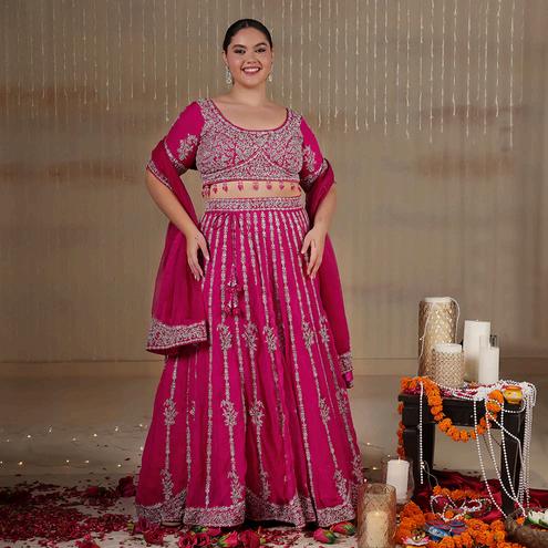 Add vibrant sophistication to your wardrobe with this fuchsia organza lehenga for women. Click here to view product details.