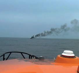 As the lifeboat Haydn Miller cleared Caldey Sound, they spotted the smoke and Coxswain Dan adjusted course, making best speed. ‘I instructed two crew members to ready the fire hose and two to prepare for a possible casualty recovery,’ says Dan. ‘Meanwhile, Tony maintained communication with the Coastguard. The crew all worked together to get everything rigged and ready to go on the aft [rear] deck. If we found someone injured, we could be facing an urgent situation.’