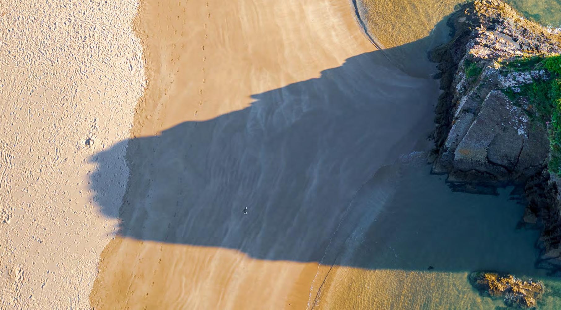 Aerial drone shot of RNLI lifeguards Tom Rodgers and George Morgan walking along Newgale beach. RNLI/(Nathan Williams). Group shot of children of Red Bay volunteer crew members, RNLI/(Nigel Millard), Nathan Williams.