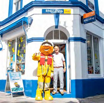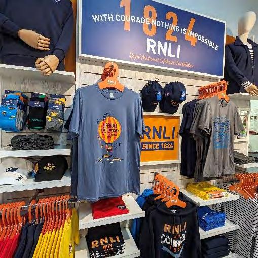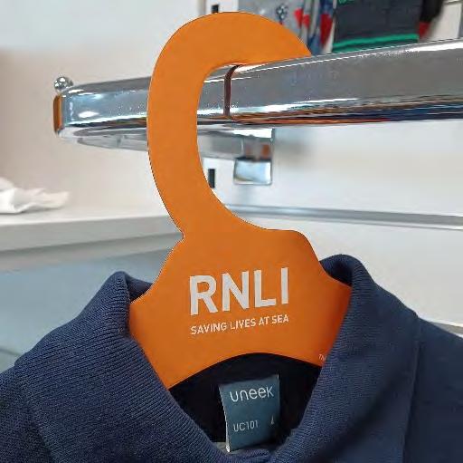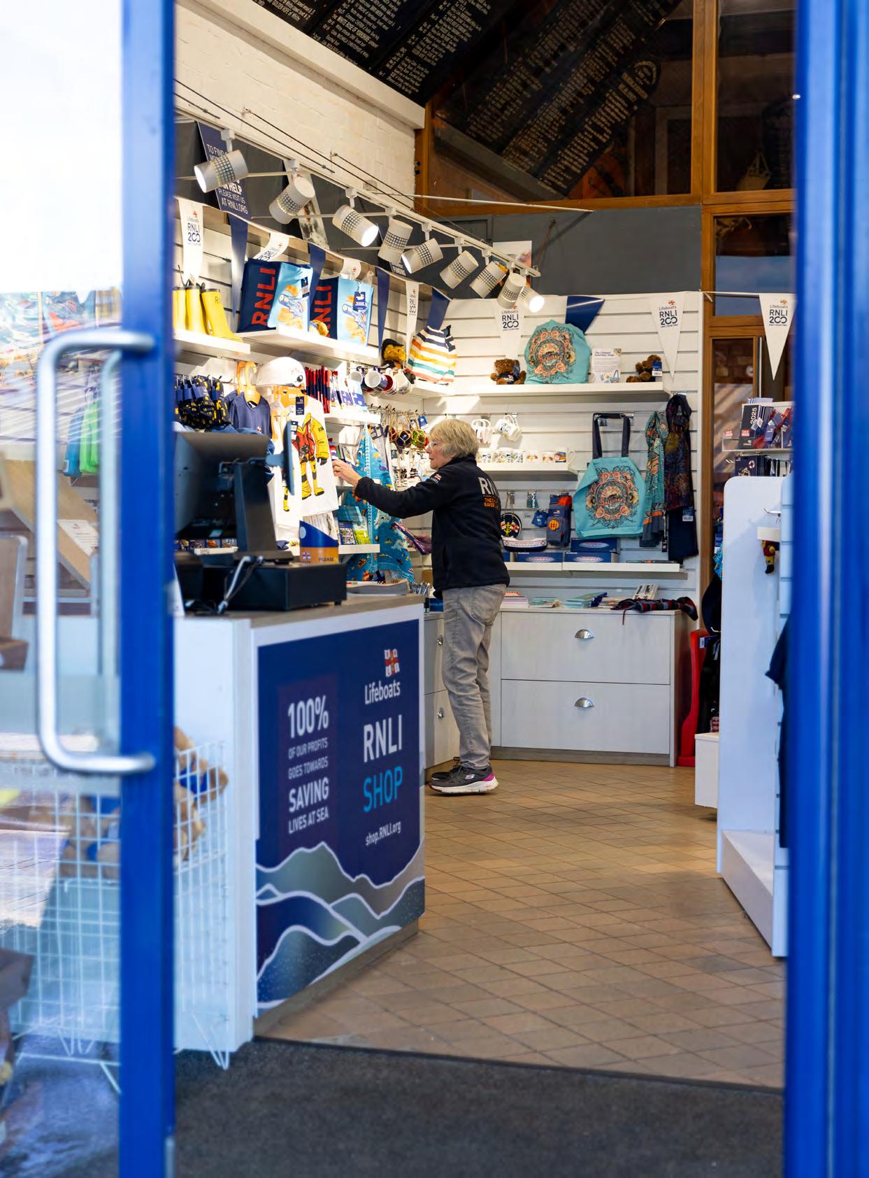 Whitby lifeboat museum shop volunteer Diana Payn. RNLI/(Nathan Williams). Cardboard RNLI hanger for retail products. Helen Glossop. Retail volunteer Terry Woods with Stormy Stan at the Plymouth RNLI shop. RNLI/(John Baldry). RNLI retail shop fittings. Helen Glossop.