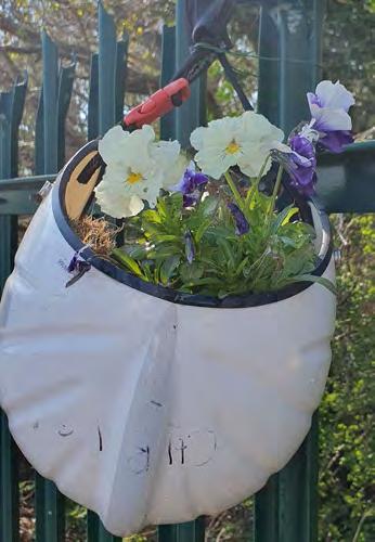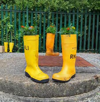 RNLI sustainability champions logo. Lucy Crichard. Old crew helmet made into hanging basket. Anne-Marie Turner. Old yellow wellies made into planters. Anne-Marie Turner.