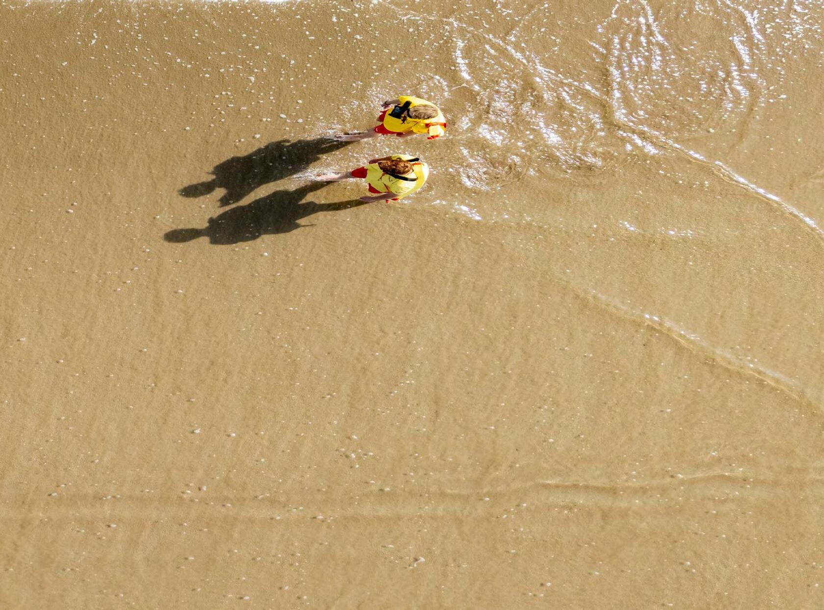 Lifeguards walking across the beach at Three Cliffs Bay, South Wales, RNLI/(Nathan Williams)
