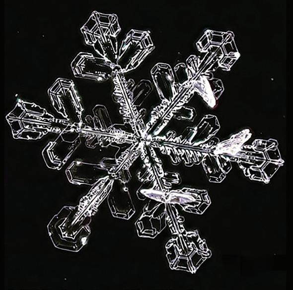 Two Stellar Dendrites snow crystals, the smaller perfectly positioned at the top leg of the larger one. See Tom's article about snow crystals and more pictures on page 25.