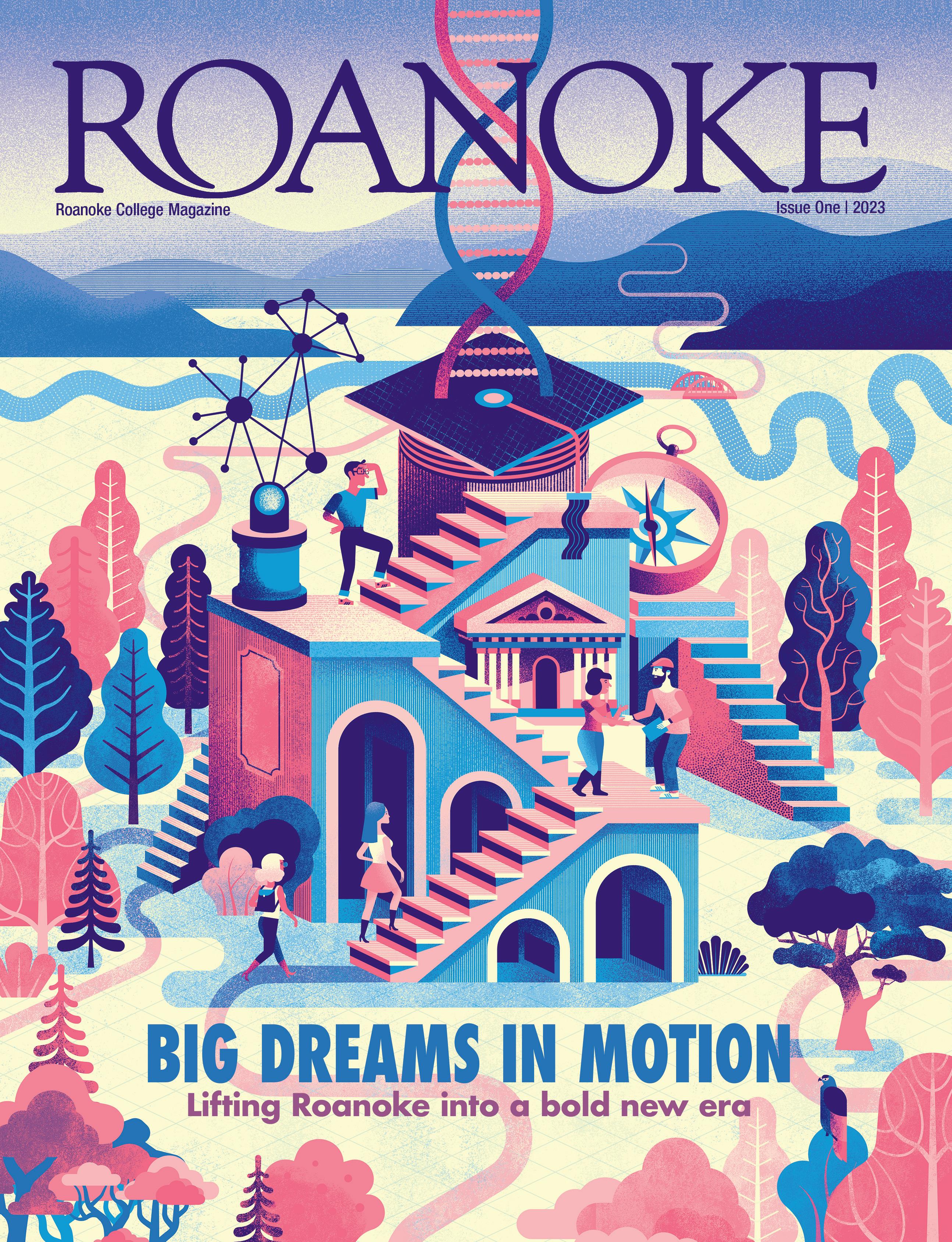 ON THE COVER: Lyon, France-based illustrator Gwen Keraval married Roanoke College imagery with his colorful, vintage design aesthetic to create a piece of cover art that represents our beloved institution’s vibrant next chapter.