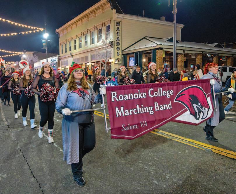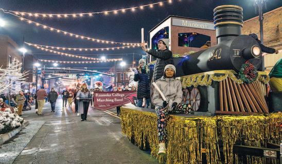 ABOVE: Students wave to crowds at the Salem Christmas Parade from a train float that was handcrafted by members of the college’s Buildings and Grounds crew. The float won Best in Show at the parade, where it was followed by the college’s new marching band.