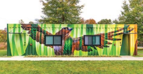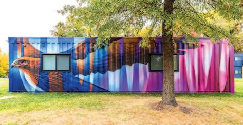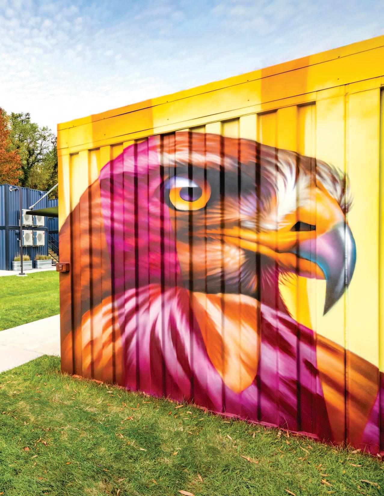 Professional muralist Jon Murrill ’09 put paint cans in student hands to create a stunning red-tailed hawk mural at Maroon Village, the college’s newest housing community.