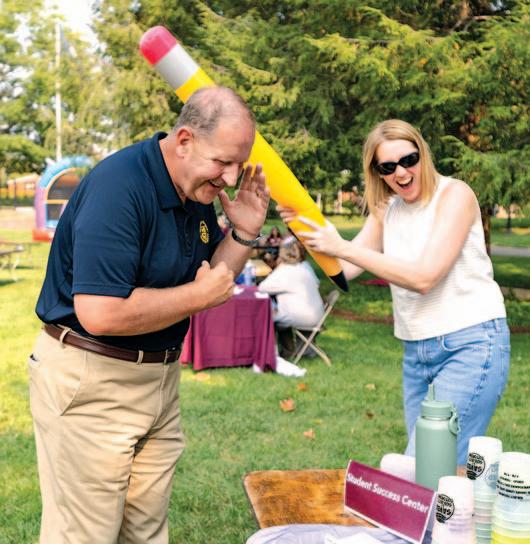 AT LEFT: Some say the pen is mightier than the sword, but Shannon McNeal, director of the Student Success Center, demonstrated at FOTQ that Campus Safety Director Joe Mills should also fear the pencil.