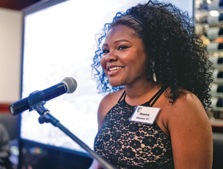 Student scholarship recipient Ifeoma Obalum ’27 speaks to Presidents Society members during an evening of gratitude on Oct. 31, 2025.
