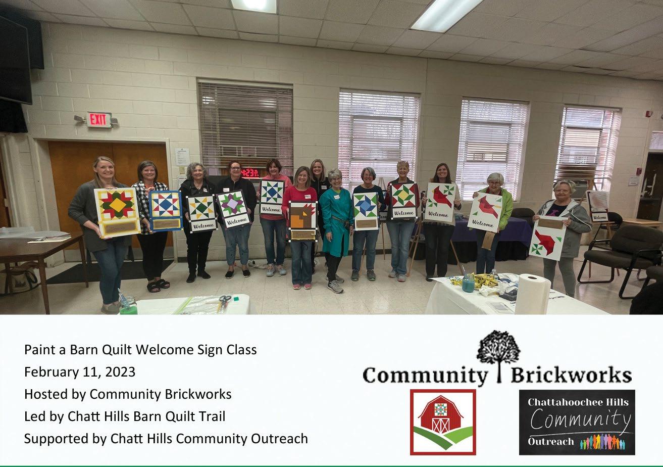 Many of the participants had admired the barn quilts on the Chatt Hills Barn Quilt Trail and were eager to try their hand at painting a smaller version in the form of a welcome sign. In the span of two hours, they learned how to tape and paint the geometric patterns that are traditional of barn quilts. And in the tradition of an oldtimey quilting bee, they also enjoyed socializing and sharing stories while they worked on their quilt projects.