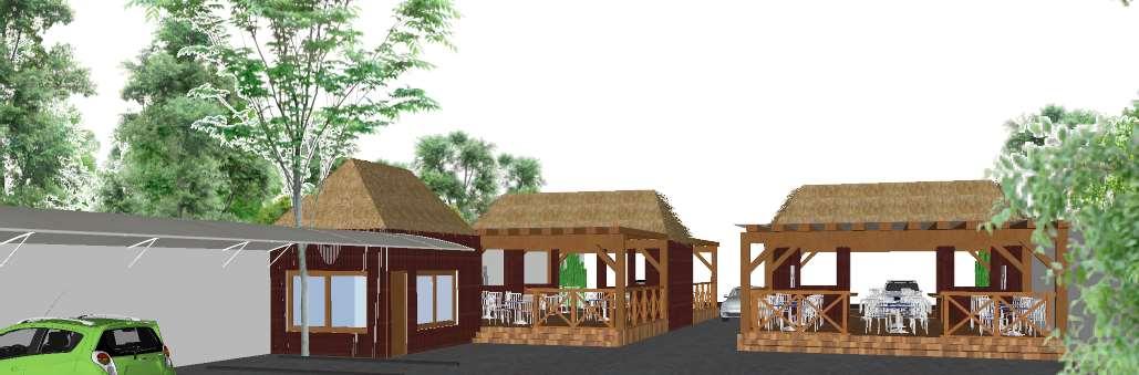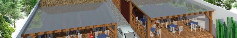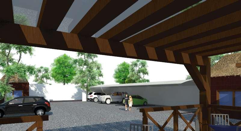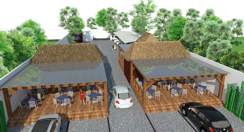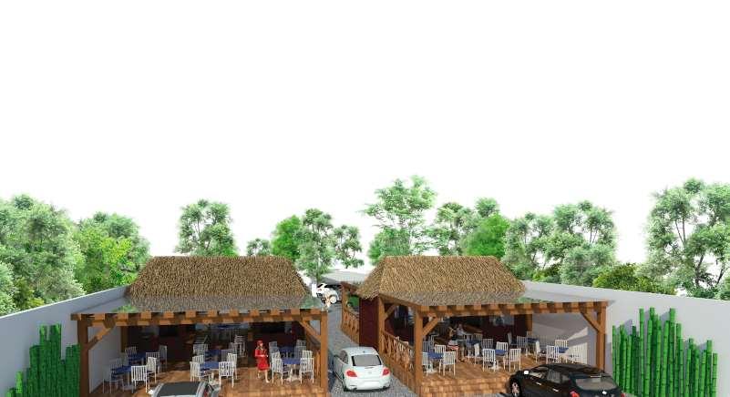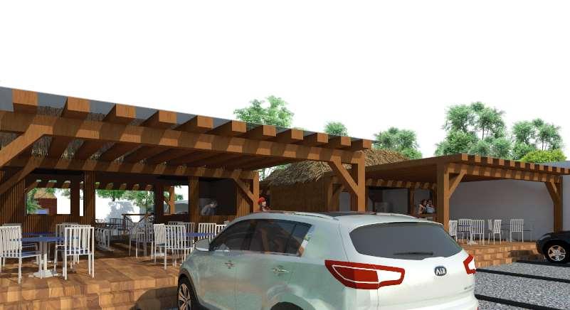 Perspectiva de la parte posterior del estacionamiento, donde es se aprecia la visual delárea de comensales y cocina.