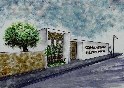 Perspectiva de la fachada principal del consultorio elaborado amano con técnicade acuarela
