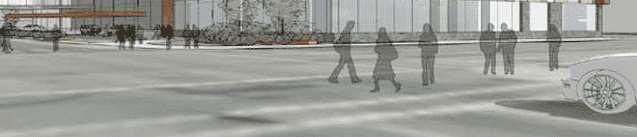 Perspectivas del interior de la plaza. Se emplea vegetación para bindar frescura al espacio y el juego de texturas del piso ayuda a contrastar todo el edificio.