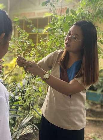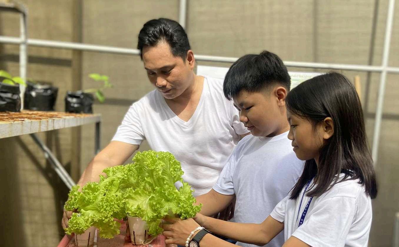 SCHOOLFARMING:Mr. Jordan assisting his students on the hydrophonic plants in the LGU-built green house Riley