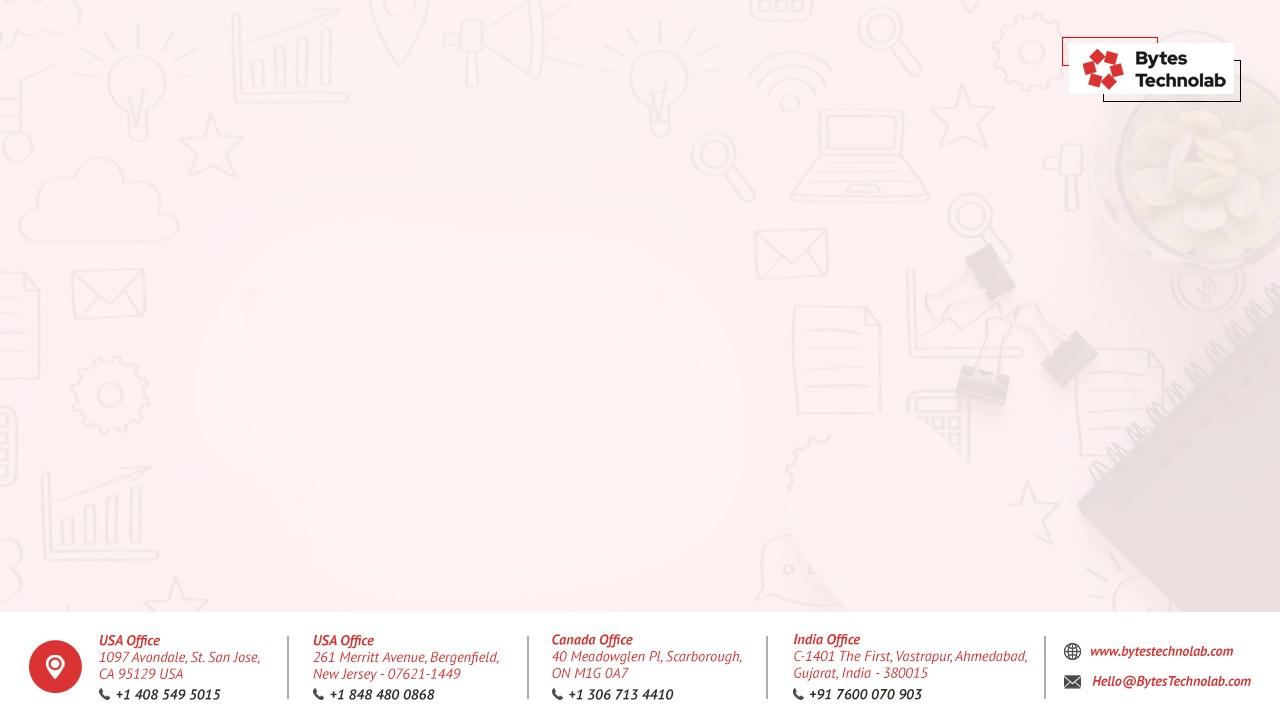 Contact Us USA 1097 Avondale St. San Jose, CA 95129 USA +1 408 549 5015 Address Contact Details Email: Hello@BytesTechnolab.com Website: https://www.bytestechnolab.com Canada 40 Meadowglen Pl, Scarborough, ON M1G 0A7 +1 306 713 4410 India D-807 The First, Vastrapur, Ahmedabad, Gujarat, India - 380015 +91 7600 070 903 USA 261 Merritt Avenue, Bergenfield, New Jersey - 07621-1449 +1 848 480 0868