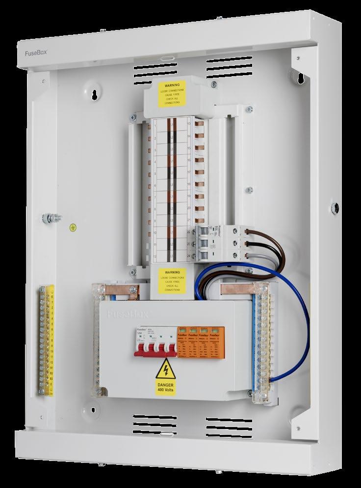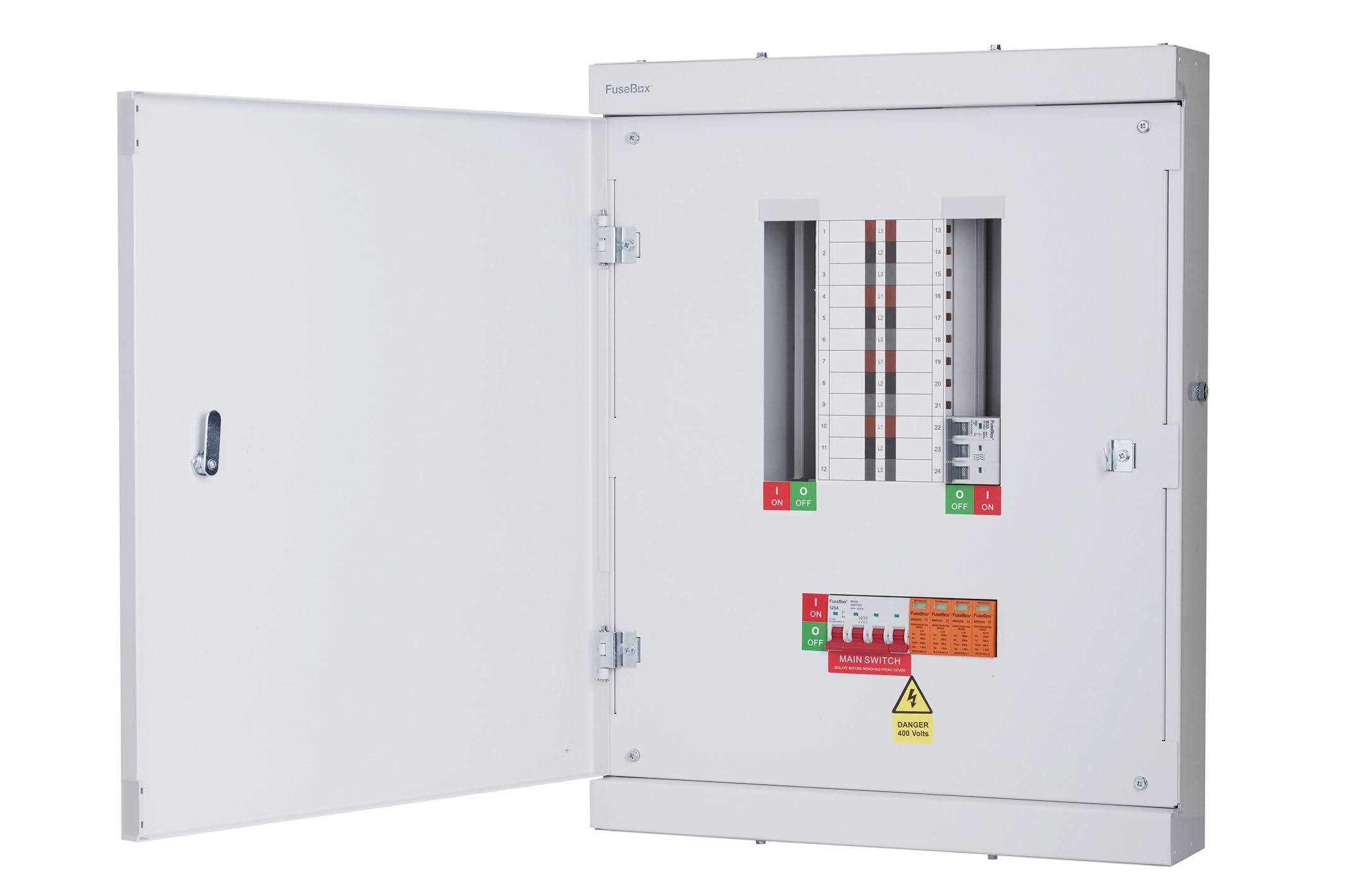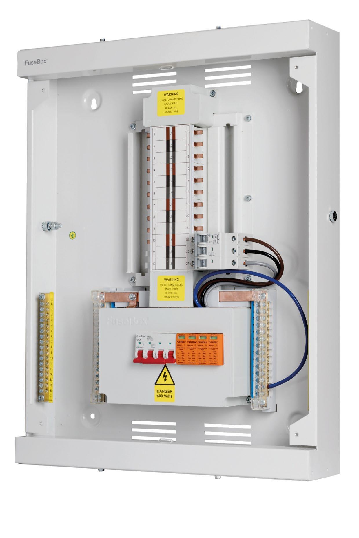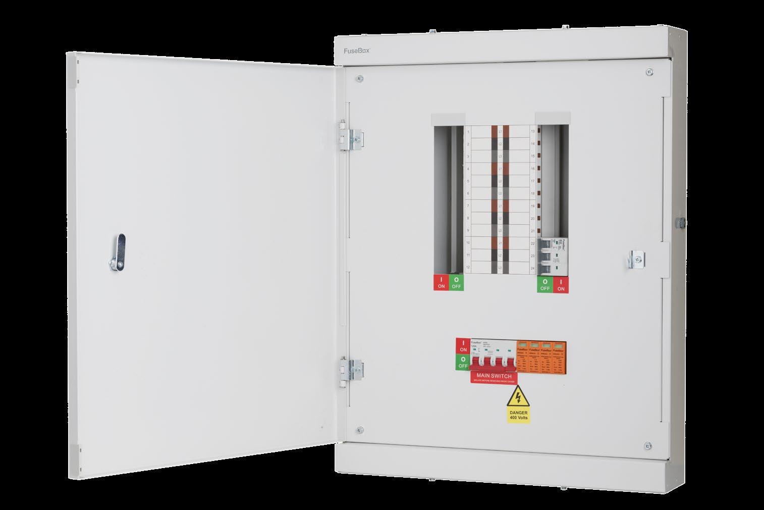 Domestic, commercial and industrial installations –the FuseBox range of TPN distribution boards, with T2 SPD and 125A 4Pole main switch as standard.