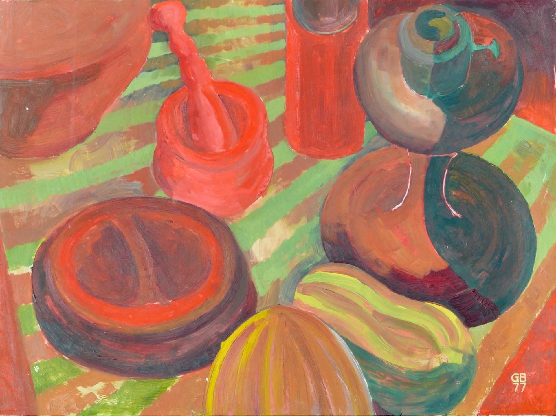Two evening art class at East Sydney Tech. The first tutor turned out to be Elisabeth Cummings. Her evenings were informal and positiveher approach was you had made the effort to come and learn and she would make the effort to encourage you to whatever your skill level. She typically gave a brief introduction to colour/tonal theories followed by exercises exploring the limited principles. I gained a lot of confidence. I have just one painting from her class‘Still Life in Red and Green’ (1977) - using colour opposites.