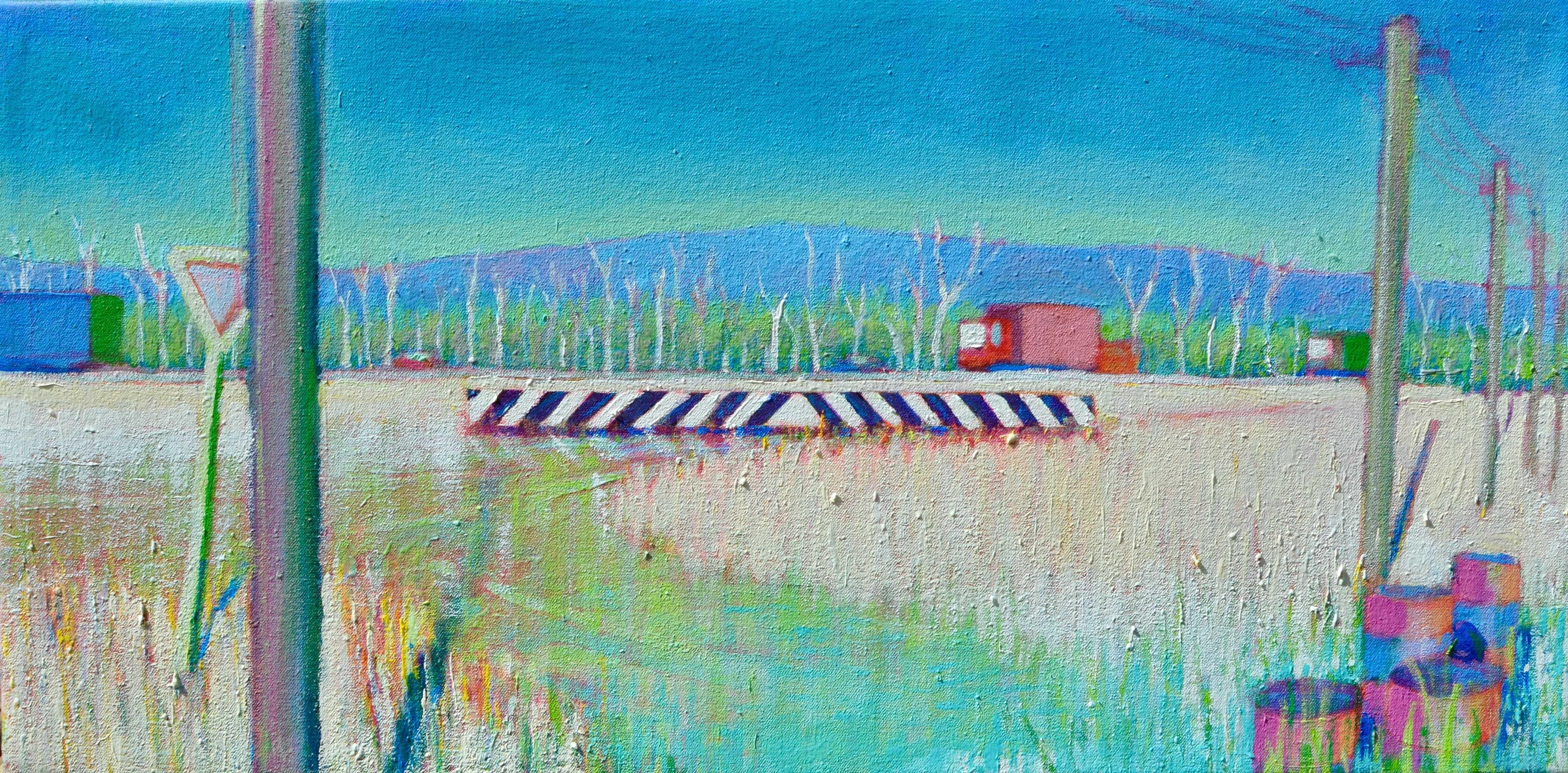 Colour choices are mostly ‘emotional’. The initial idea is put through a process of re thinking and analysis (sometimes to question if it’s worth the effort ) then reconstructed via a series of sketches at A4 size. These are photocopied and evolved further by tracing and retracing the successive images onto greaseproof paper, then, making more photocopies and going through the whole process again. Often I’ll expand the original sketch by attaching more A4 sheets around the sides to expand the image or allow options for other formats and images eg. ‘Roadhouse’ and ‘Bypass’ are brothers, ‘Colonnade’ has two similar ‘siblings’. When I’ve got an acceptable image (by then it could be A3 or even A2 size) it’s squared up then transferred onto the canvas. ‘Delivery of the Keys’ was generated in this way. The downside is that the evolutionary process is essentially ‘disposable’ - leaving only scrappy pieces of paper held together with sticky tape - so no sketchbook records.