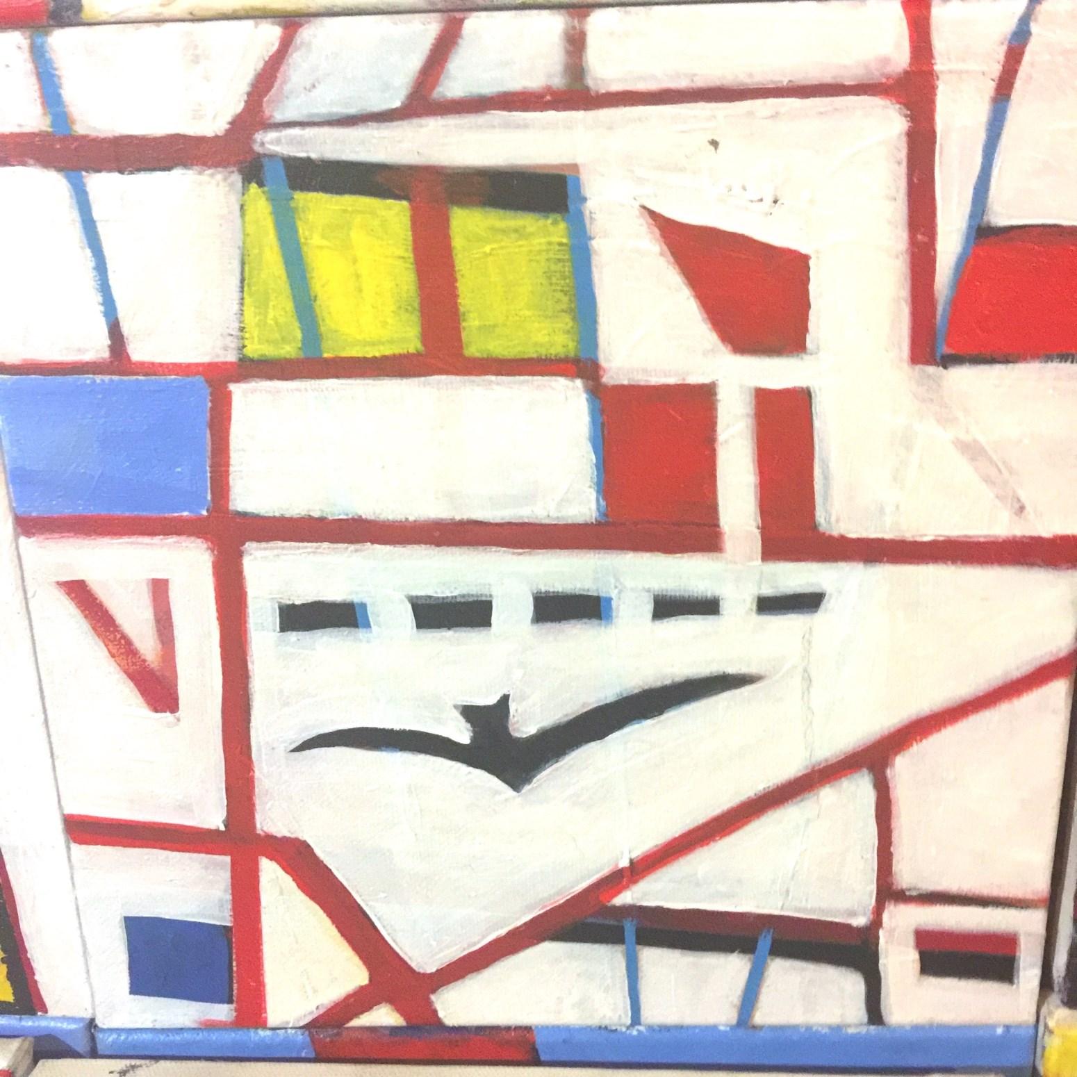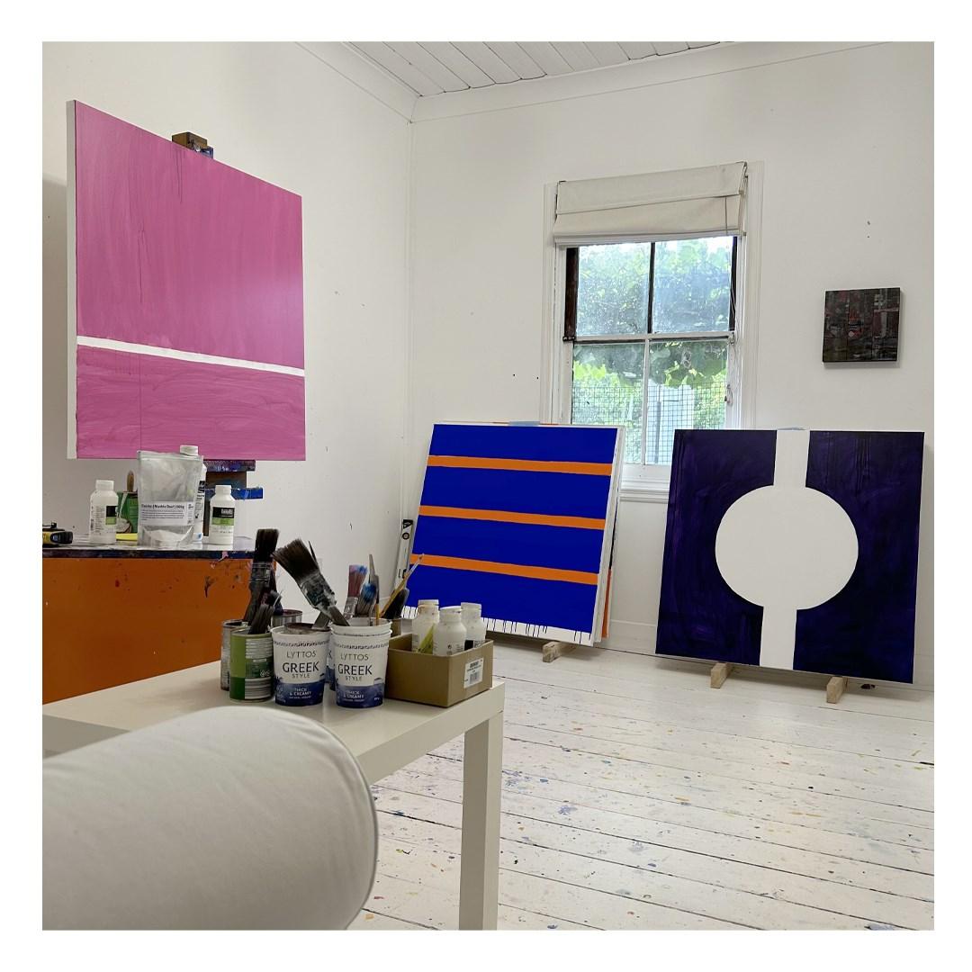 Cropping and composing are something that I like to do in my mind all the time, playing with shapes and weight. I like a square format, as I have a photography background and particularly like medium format cameras that use a square frame. Painting appeals to me, because it is a process of slowly assembling an image and in that sense rather like analogue / studio photography. I have worked to make compositions that go beyond the boundaries of the canvas, to give an architectural feeling to my paintings. Some compositions are drawn from the built environment around me. In particular the industrial architecture, machinery and infrastructure of Newcastle and the Hunter Valley. Others just have a certain “ je ne sais quoi”. I make a lot of small square sketches in my journals, using gouache and watercolour. Choosing the ones that pop to explore on a larger ground. Investing time into preparing my supports, using lots of gesso, sanding meticulously between coats to provide a luxurious white paperlike surface to draw / paint on. My work is an expressive hard edge abstraction, sometimes employing geometry. I don't use a ruler or tape. The slips, accidents and imperfect lines are embraced. I love art materials, pigments come from exotic places, ultramarine blue from a particular mountain in Afghanistan. All the cadmium colours are highly poisonous, I love them. Colour has power, I like to use strong colour. Abstraction is like music without lyrics. More than colours and shapes, abstract painting comes from within and in that sense can be viewed as an extension of genres such as portraiture and landscape. Music is important in my practice and I never work without it. Titles to the works in this show are from the music I listen to in the studio which is a mix going back over my entire life.