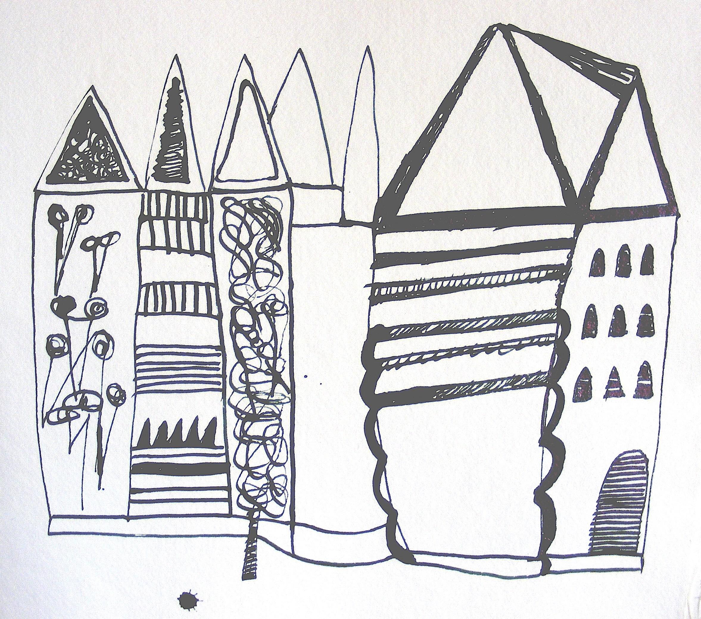 John Parkes contributes a series of ink and watercolour drawings - his main practice in textiles can be seen in the line work, creating a visual stitch, like visible mending on the paper, each studies narrative and weaves humour into the subject.