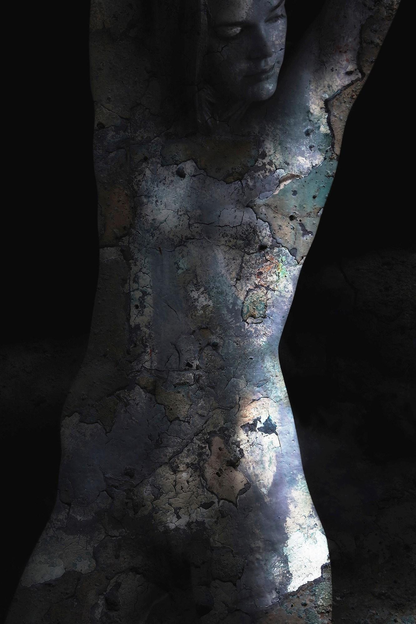 Edmond's work is "lay-ered" in many senses of the word. The human body is layered between or beneath images -rock, rubble, graffiti shreds, walls, fronds, tree textures. Careful compositions that beguile and draw in both the eye and mind. The works are thus layered both visually and in the attempt to interpret and define.