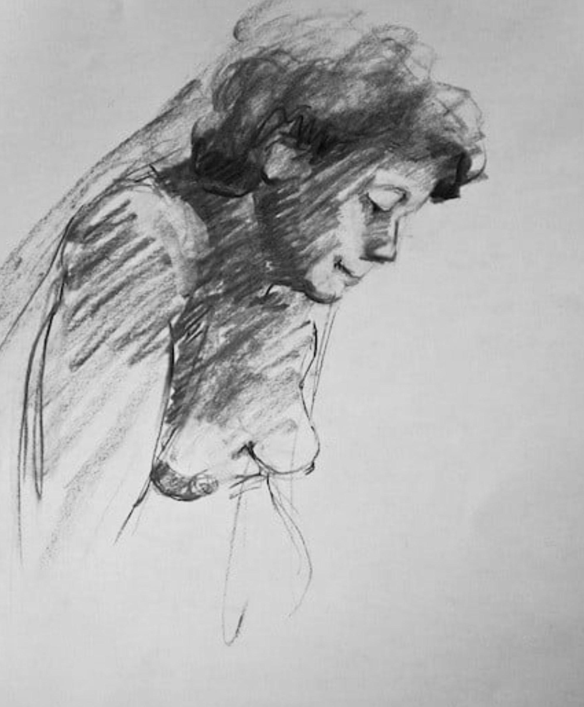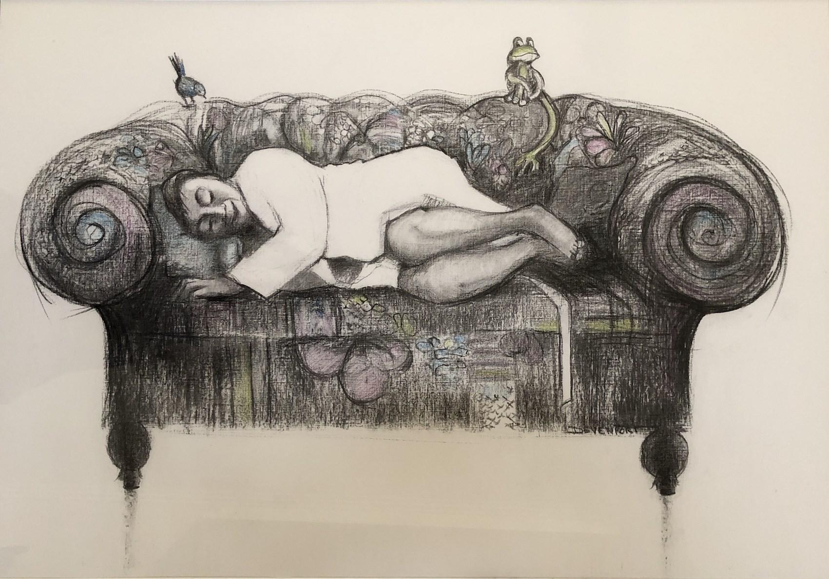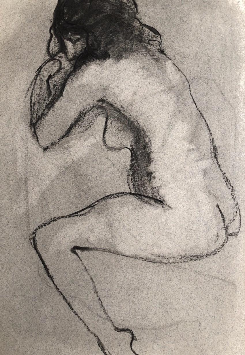 The female body forms the basis of his art-works; it may be softened and blended, the lines melding, melting into the layers of the piece until one's eyes start to actively search for the lines the mind tells you must be there; or the model's body may leap from the work like some goddess of old, breaking through time, stone and canvas, demanding one's attention and admiration; while also seeming to escape the bounds of the piece, of defini-tion, of objectification.