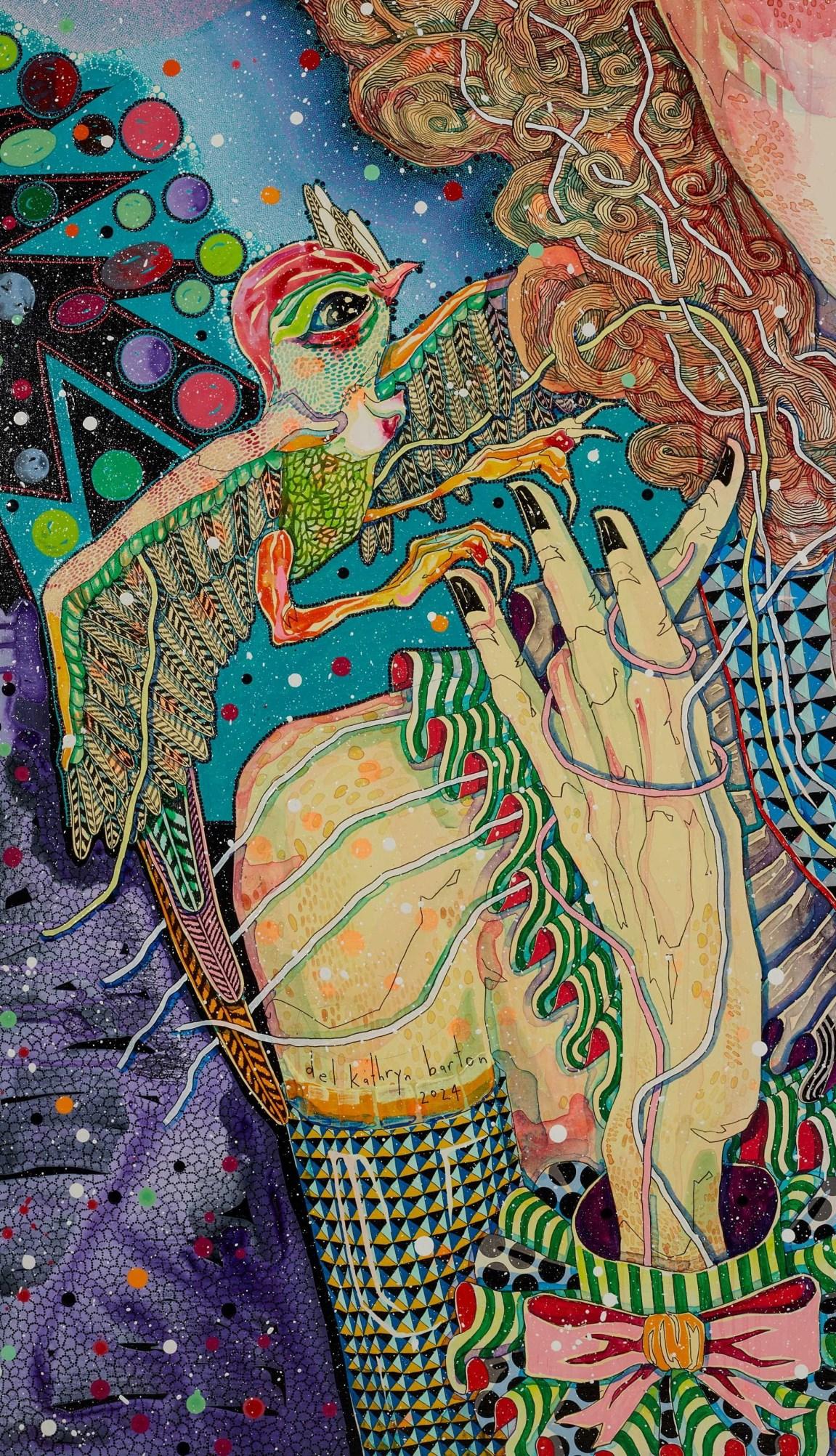 “The paintings explore the symbolic language of femininity, interweaving references to traditional folklore and the cosmos. Barton’s practice is grounded in self-referentiality, drawing from a euphoric, emotional inner world”.