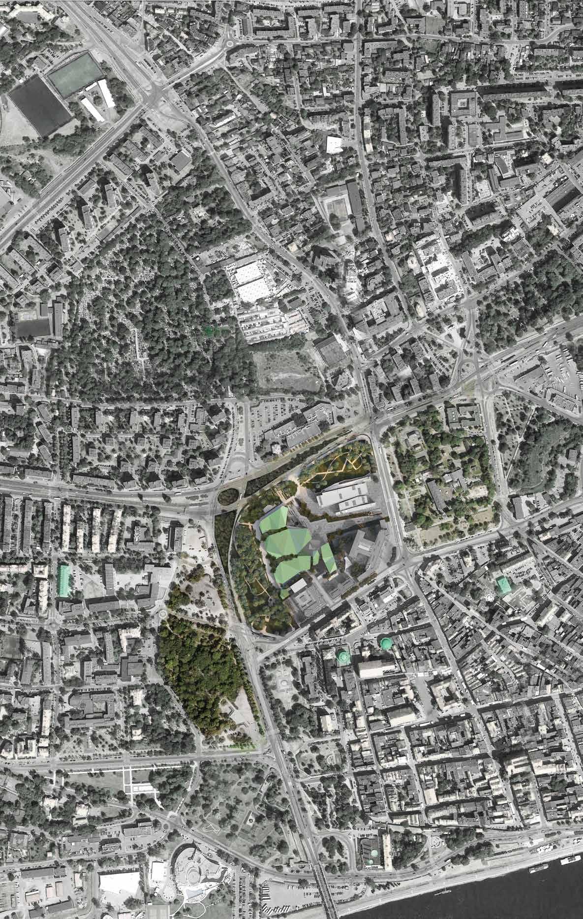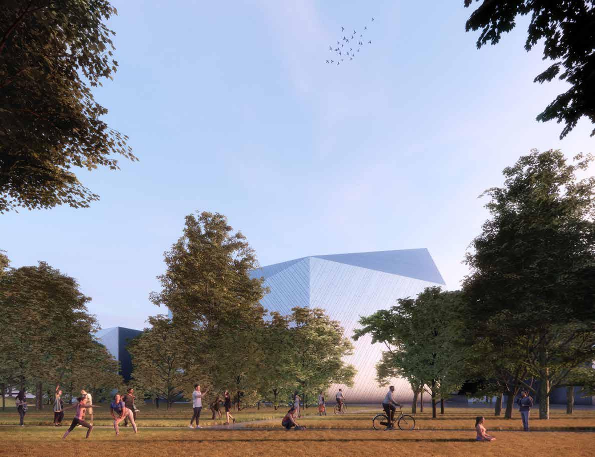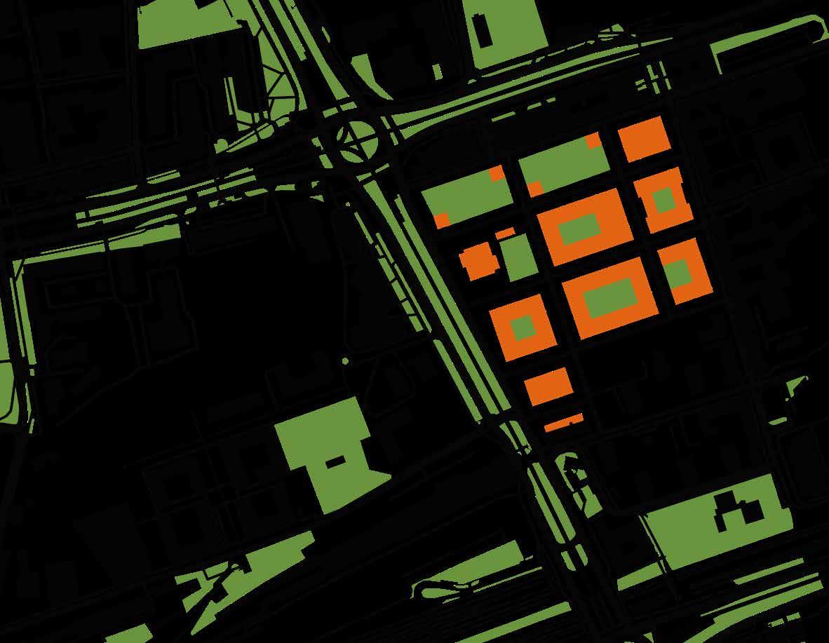 GREEN BUFOR New park spaces between existing dense office spaces and new urban tissues