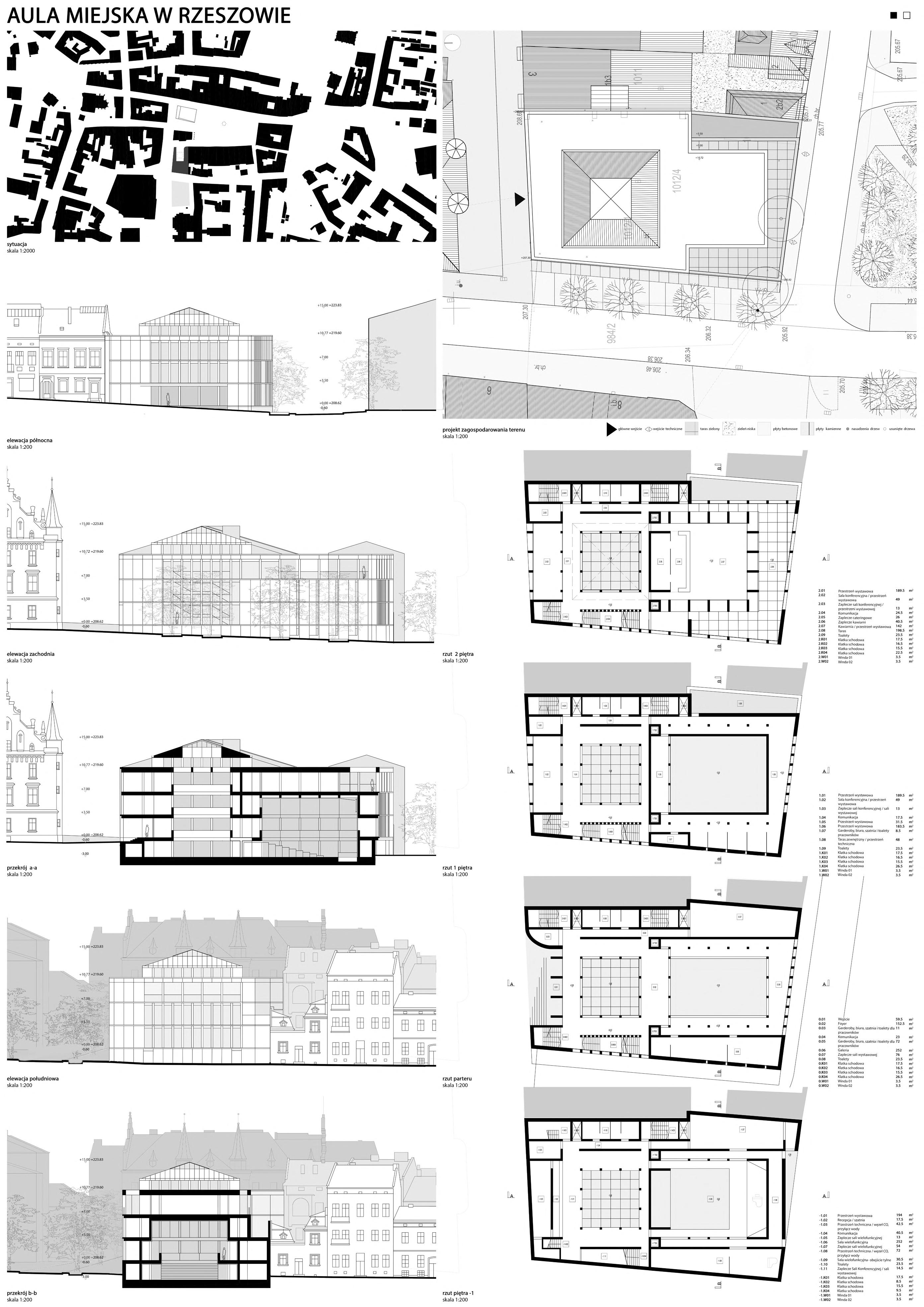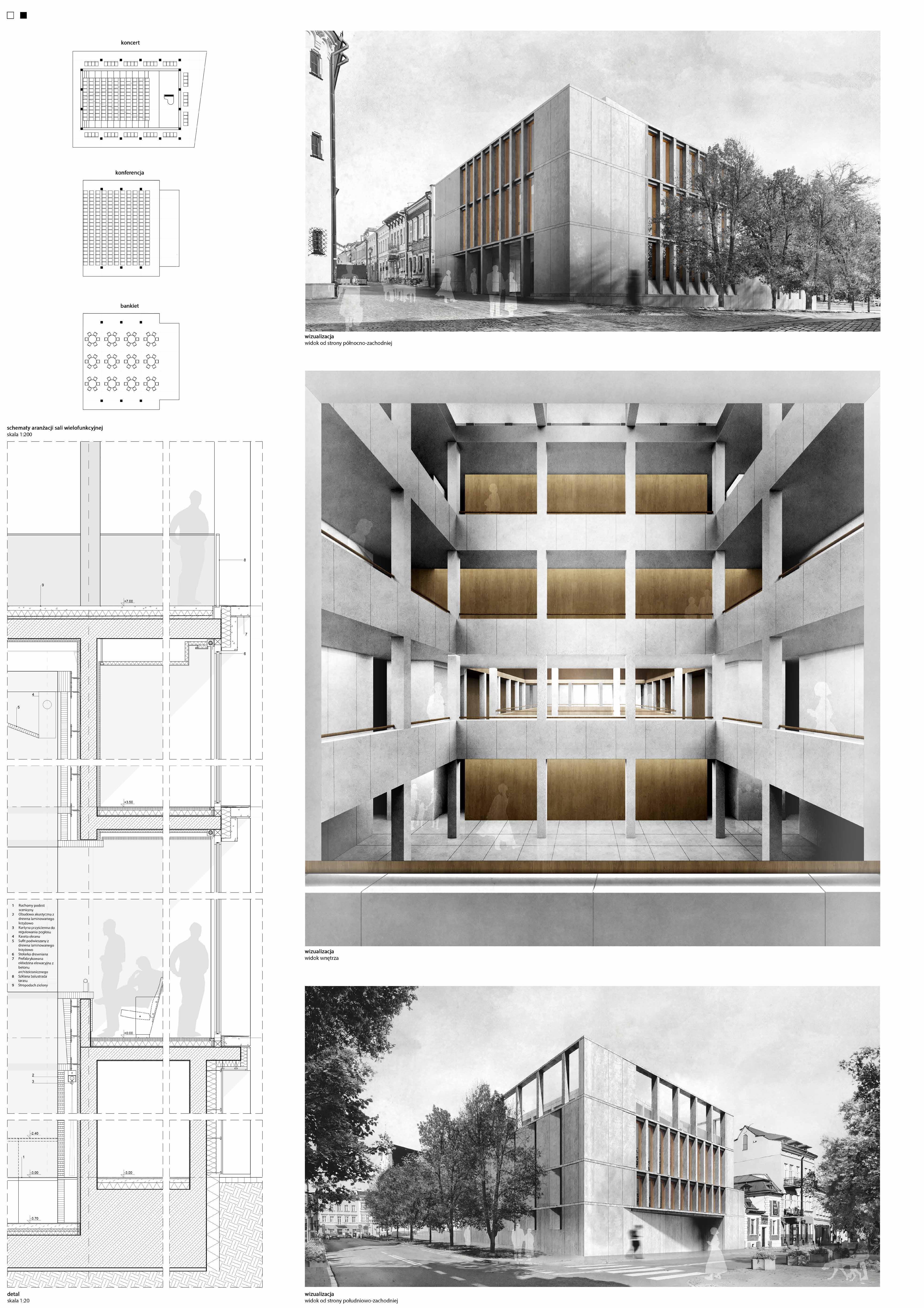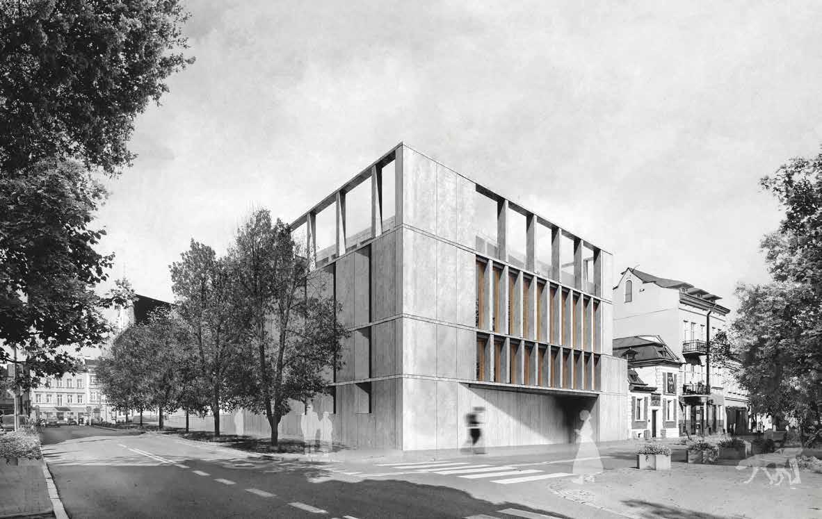 The new City Auditorium, designed for conferences and exhibitions, is set to be located next to the Rzeszów Town Hall in the old town, replacing the current parking lot. The municipality, in collaboration with the local SARP branch, organized an architectural competition for the project. The building is expected to include a multifunctional hall with tiered, mobile seating for approximately 200 people and an exhibition space of 600-800 m². Plans also include a café and a publicly accessible rooftop terrace. The entire auditorium will cover approximately 2,800 m².