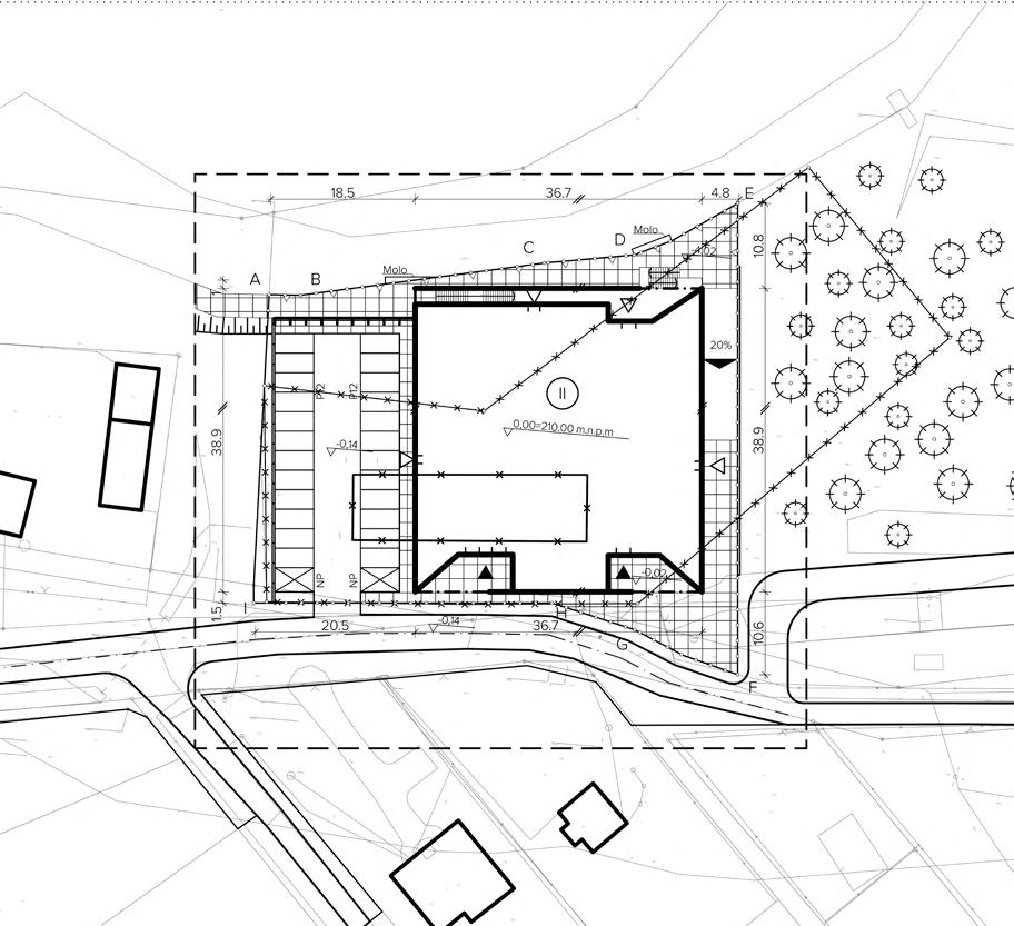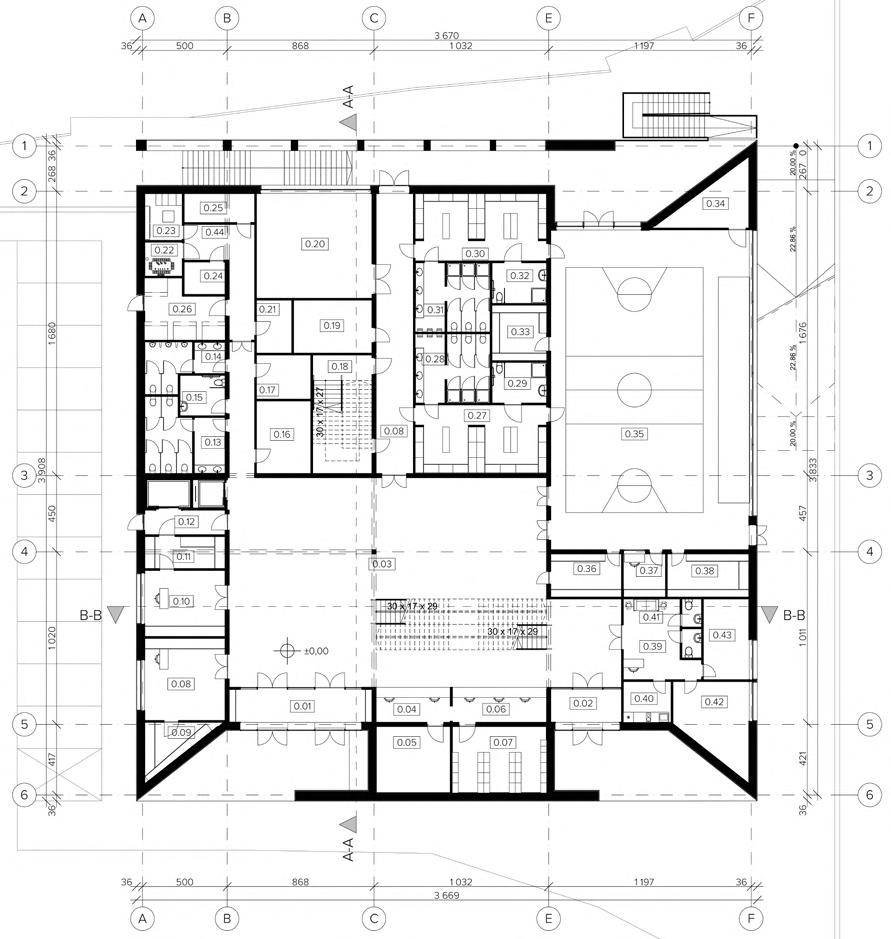 The project for a new sports and recreation center for the small town of Troniny is located on a site with a degraded warehouse building and remnants of post-war bunkers adjacent to the local forest. Inspired by the „bunker,” the building’s form emerged as a heavy, simple shape, additive in nature like Romanesque architecture, symbolizing a Stone in the Forest.