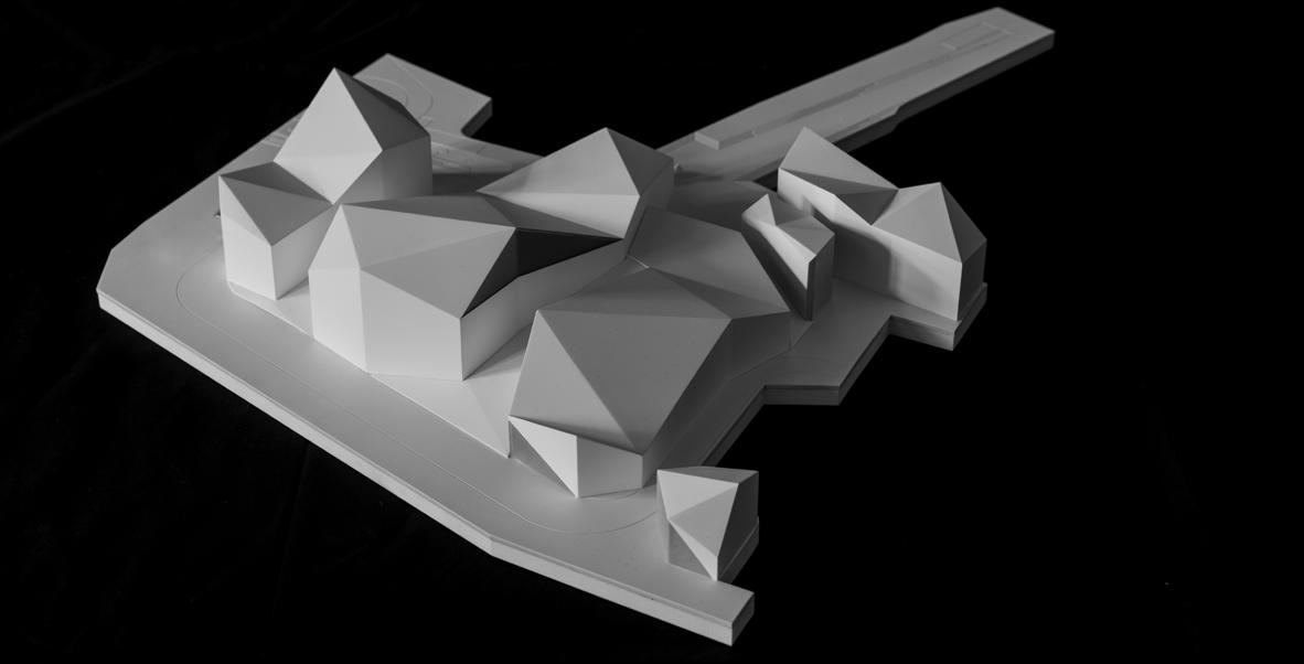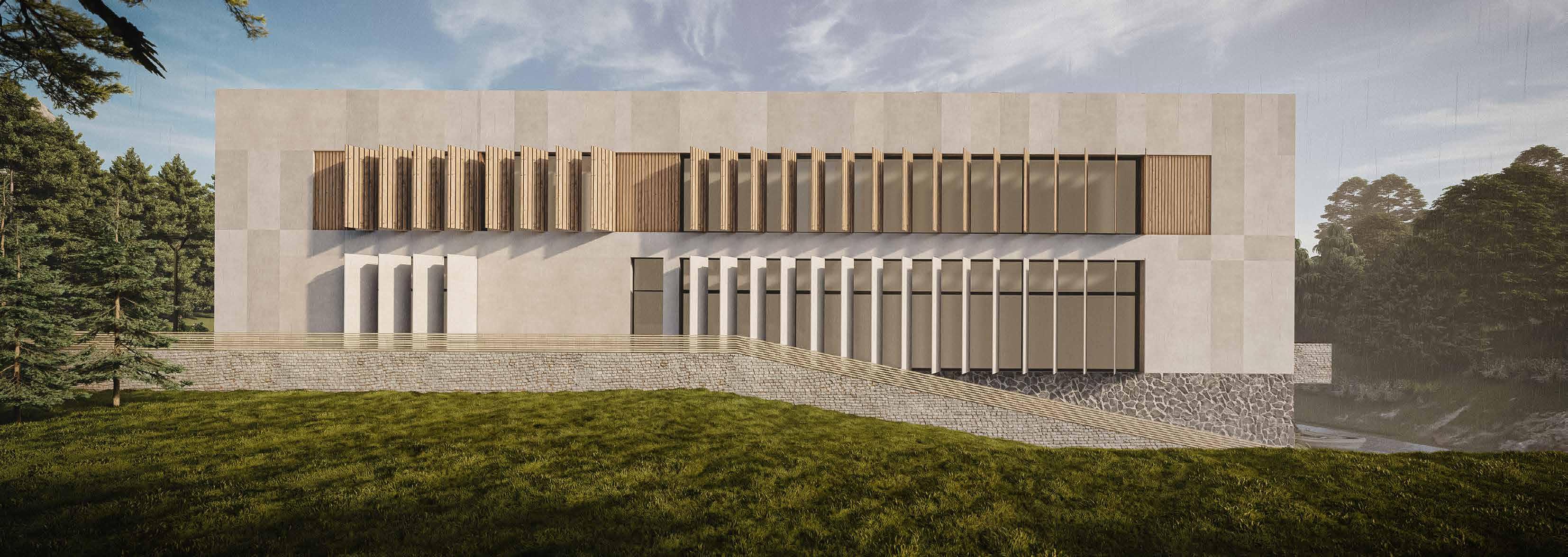 Concept Design for a New Intimate Sports Center in the Small Town of Troniny: The design concept was inspired by the wartime bunkers in the area, resulting in a heavy, brutalist form hidden in the middle of the forest. The center includes a sports hall, gym, and hotel.