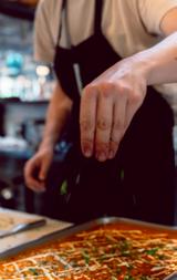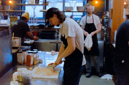 Prep for service is still in full swing while family meal is being made, so the balance and teamwork must be well-orchestrated. While line cook Nate Zimmerman preps tomatoes for dinner service, he also stirs Moynihan’s curry for family meal.