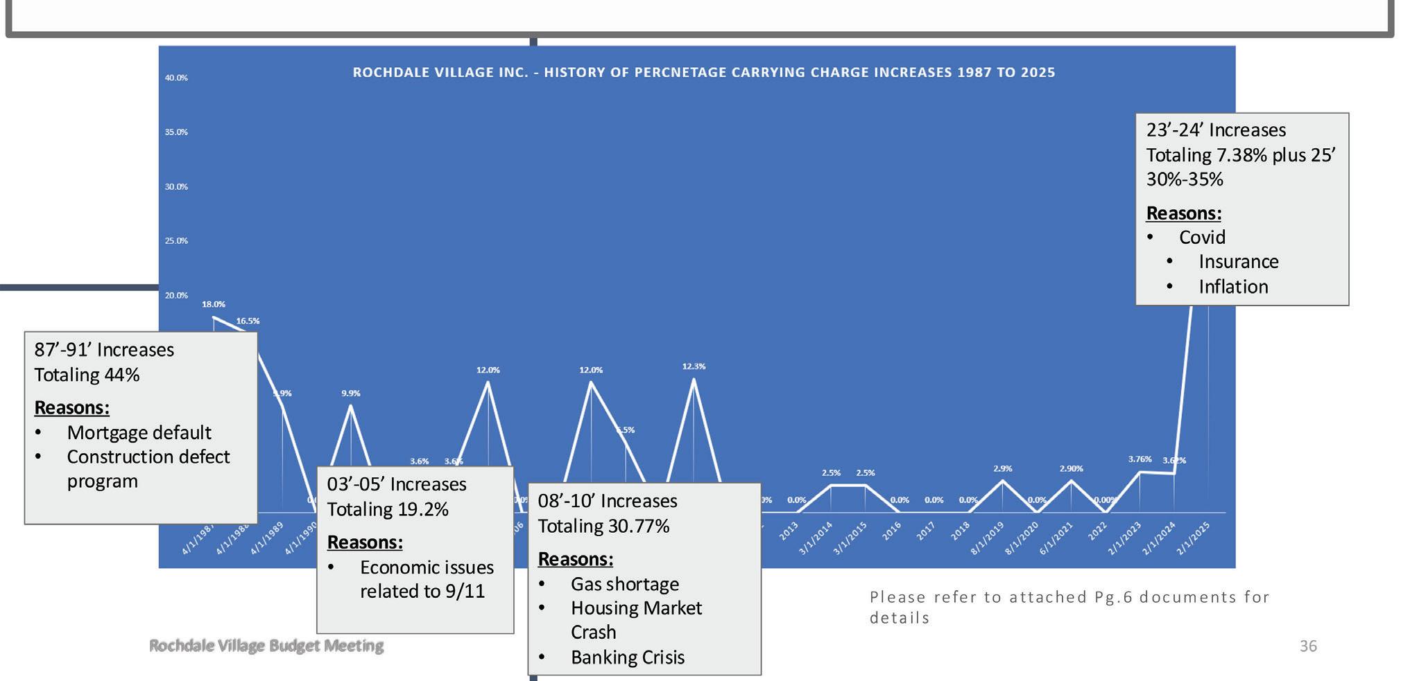 Mitchell Lama communities are budgeted similarly to not for profit entities. The idea is to bring in just enough revenue to cover expenses. This methodology works if there are no major “bumps in the road” that break the budget. In Rochdale’s carrying charge increase history we can see data points over the last 30 years that point to bumps in the road and the carrying charge increases that follow (see chart below).