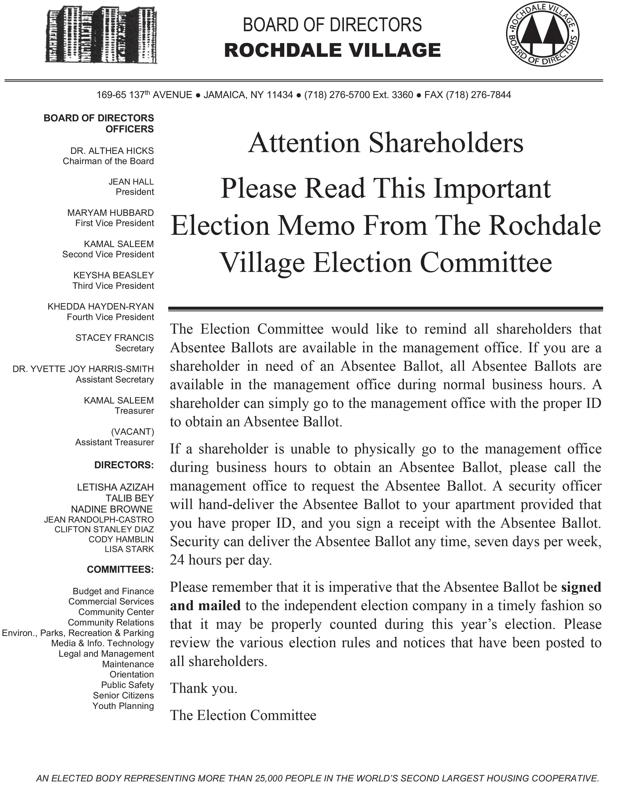 1) The 2024 Election for Directors of Rochdale Village, Inc., will take place during the Stockholders meeting on Tuesday, October 1, 2024.