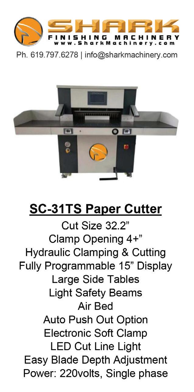 Shark Finishing Machinery manufactures and distributes digital print finishing solutions. The Shark line offers a variety of equipment such as creasers, perforators, paper cutters, corner rounders, business card cutters, stitchers, UV coaters, perfect binders, paper joggers, and much more. Shark distributes through a global network of dealers and distributors and aims to become the most trusted name in the digital print finishing Industry. See ourad, page 18.